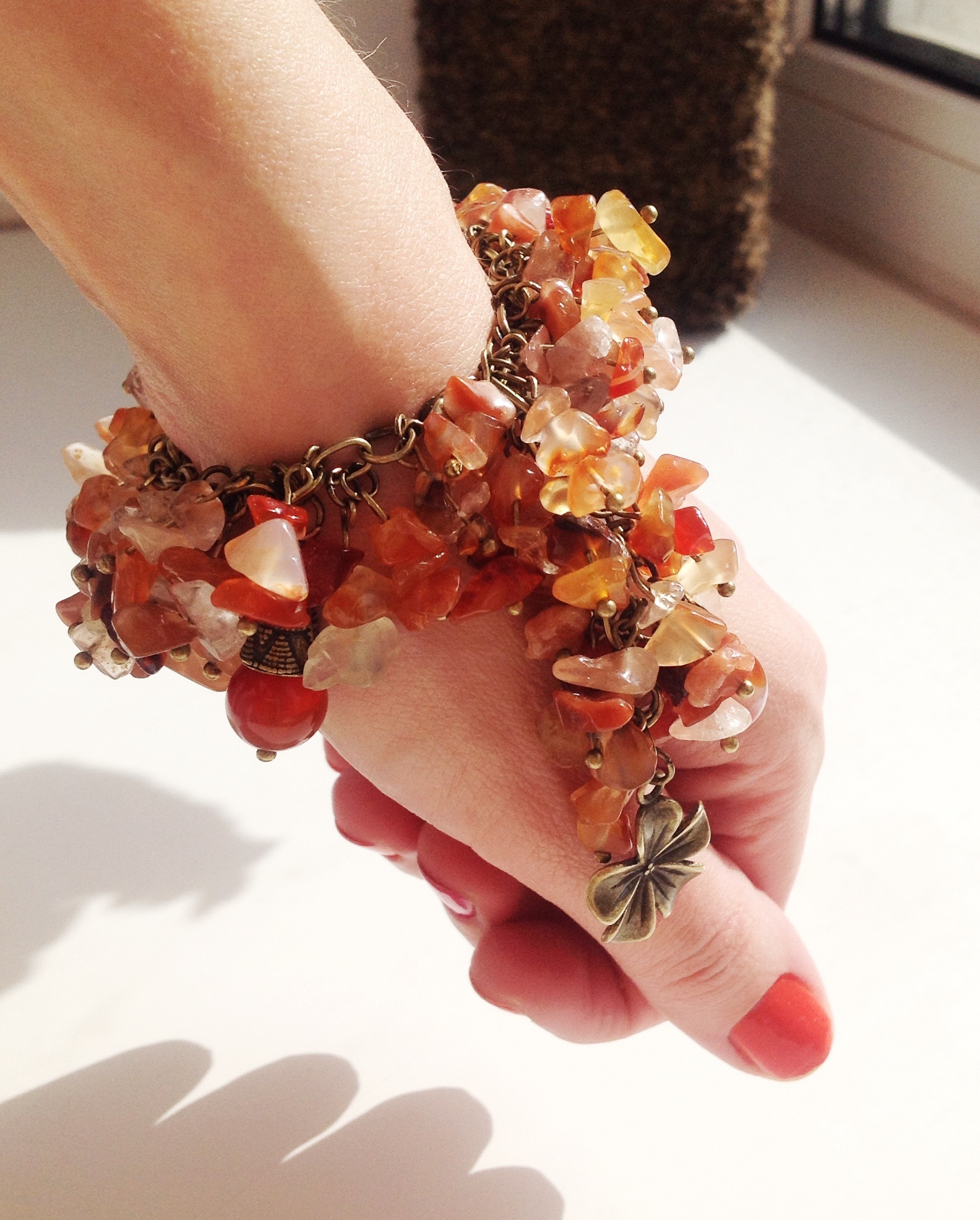 Из всех полезных каменных украшений, больше всего люблю браслеты. У меня их аж 8 штук из: яшмы, коричневого обсидиана, розового кварца, бычьего глаза, аметиста, гелиотропа с моховым агатом, авантюрина и сердолика. В зависимости от ситуации, ношу регулярно каждый из этих браслетов, обычно на запястье левой руки.