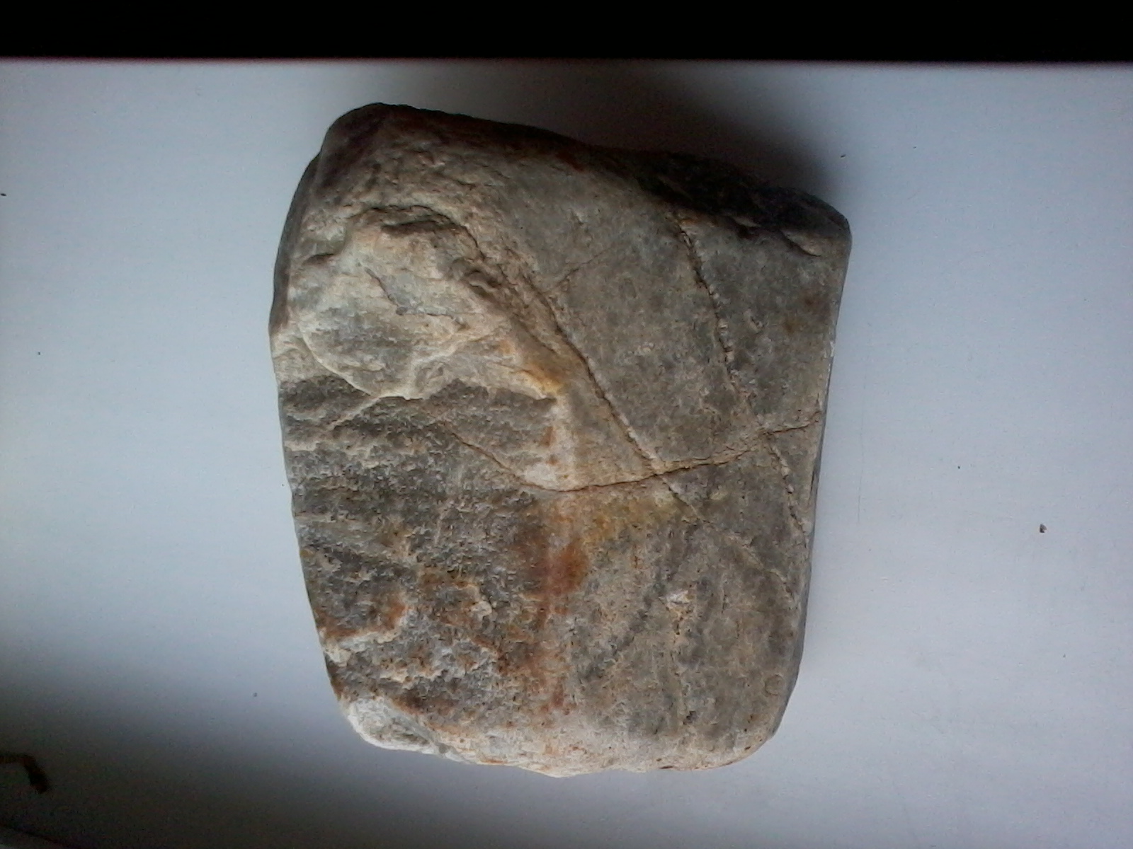 В карьере змеевика попался вот этот камень. По виду кварц, но взяло сомнение — не раковистый на изломе, непонятный цвет черты: не то металлический, не то белый. Да и как-то кажется тяжеловат он для такого объёма.
