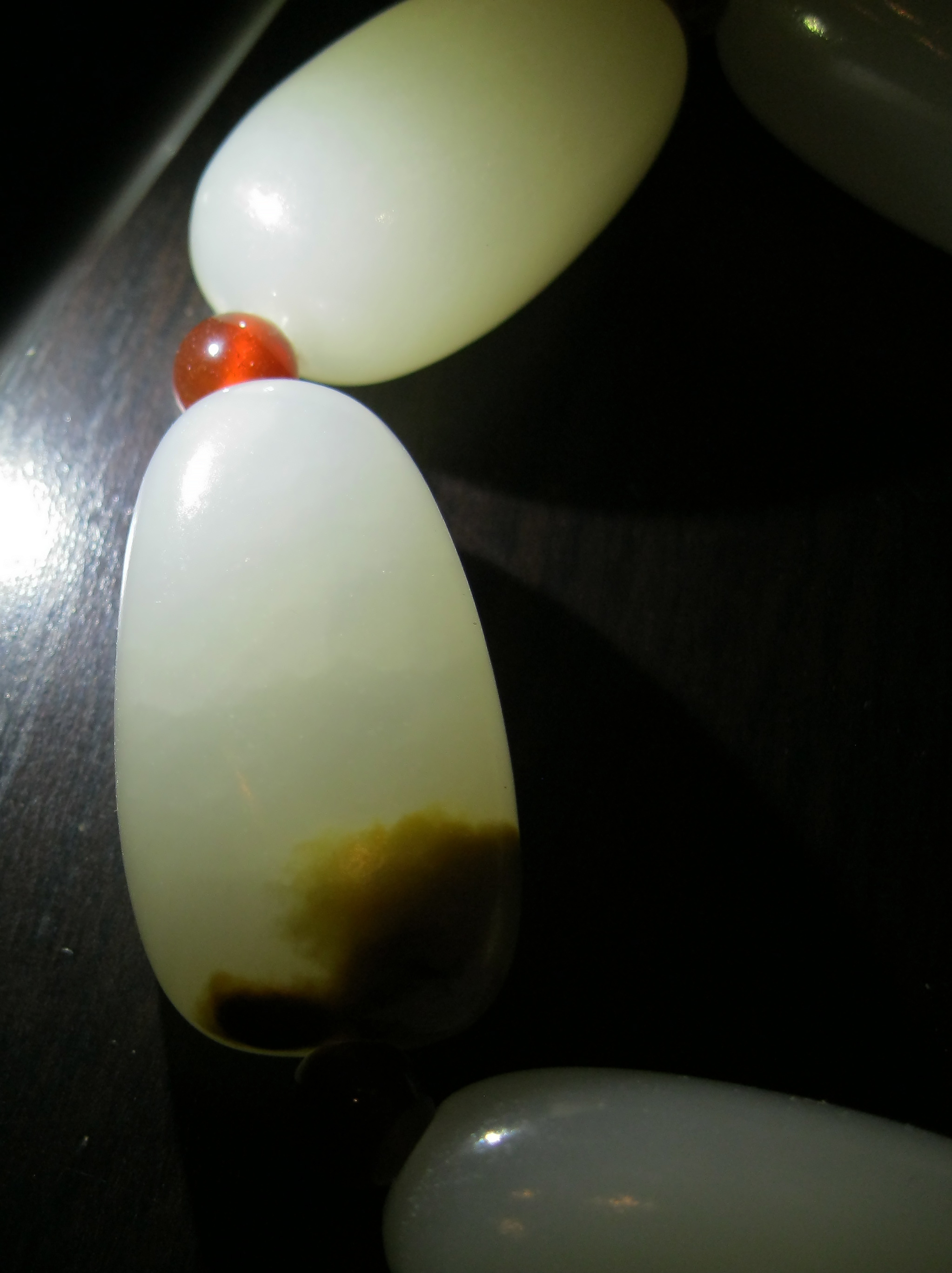 Когда-то давным давно мне продали четки якобы из белого нефрита. Потом я только понял, что они сделаны из оникса. И вот этот браслет в точь-точь по цвету, блеску, тяжести и хрупкости похож на эти самые четки.