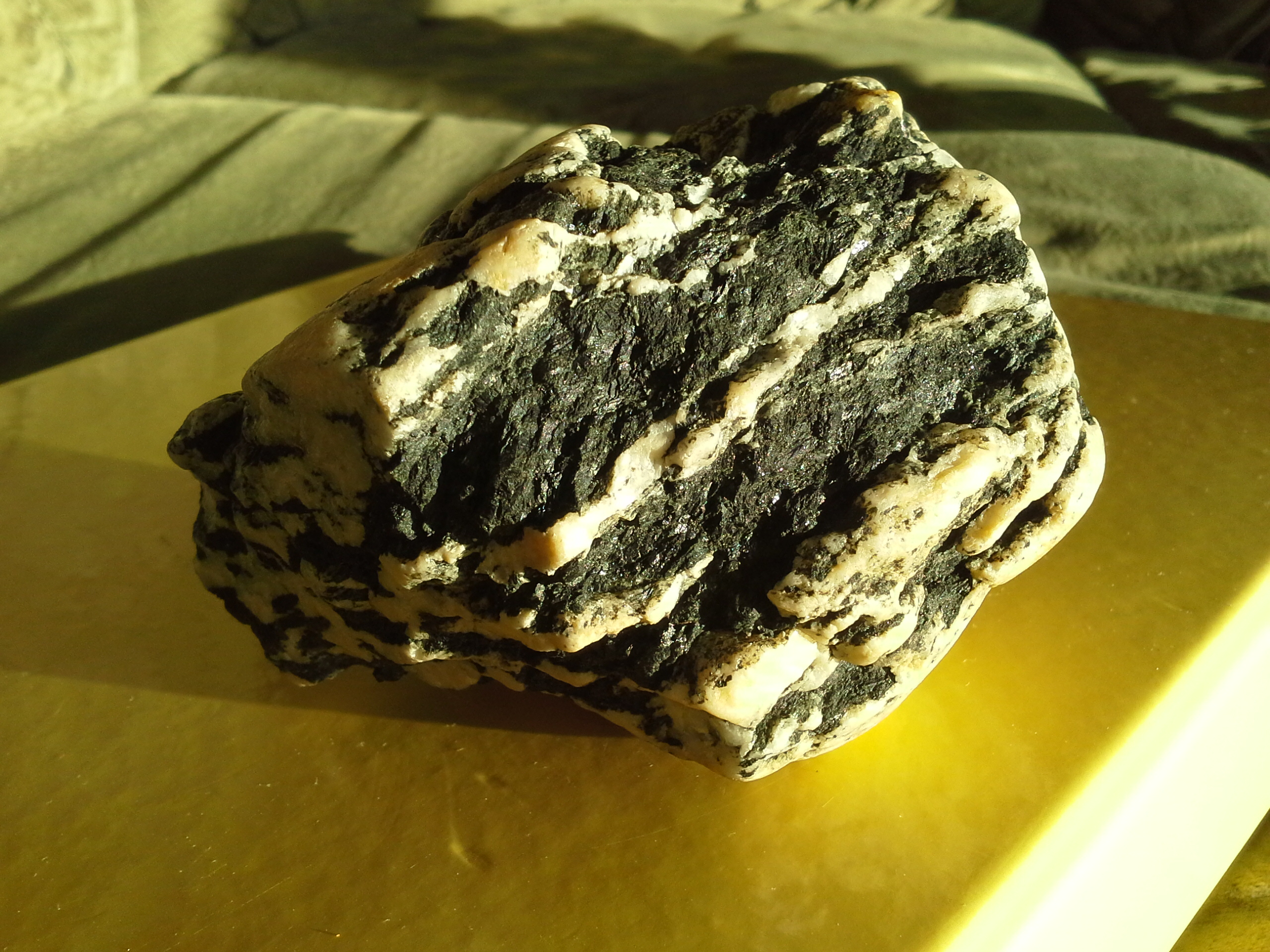 Чёрные прослойки состоят из блестящих чашуек, состоящих из продольных волокон, видных невооружённым глазом.