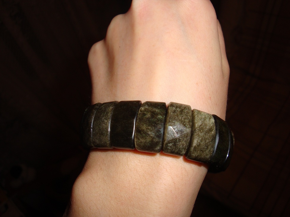 Это обсидиан. На нем может присутствовать эффект, напоминающий эффект кошачьего глаза, вызванный присутствием большого количества микропузырьков, если приглядеться внимательно, то их можно увидеть.
