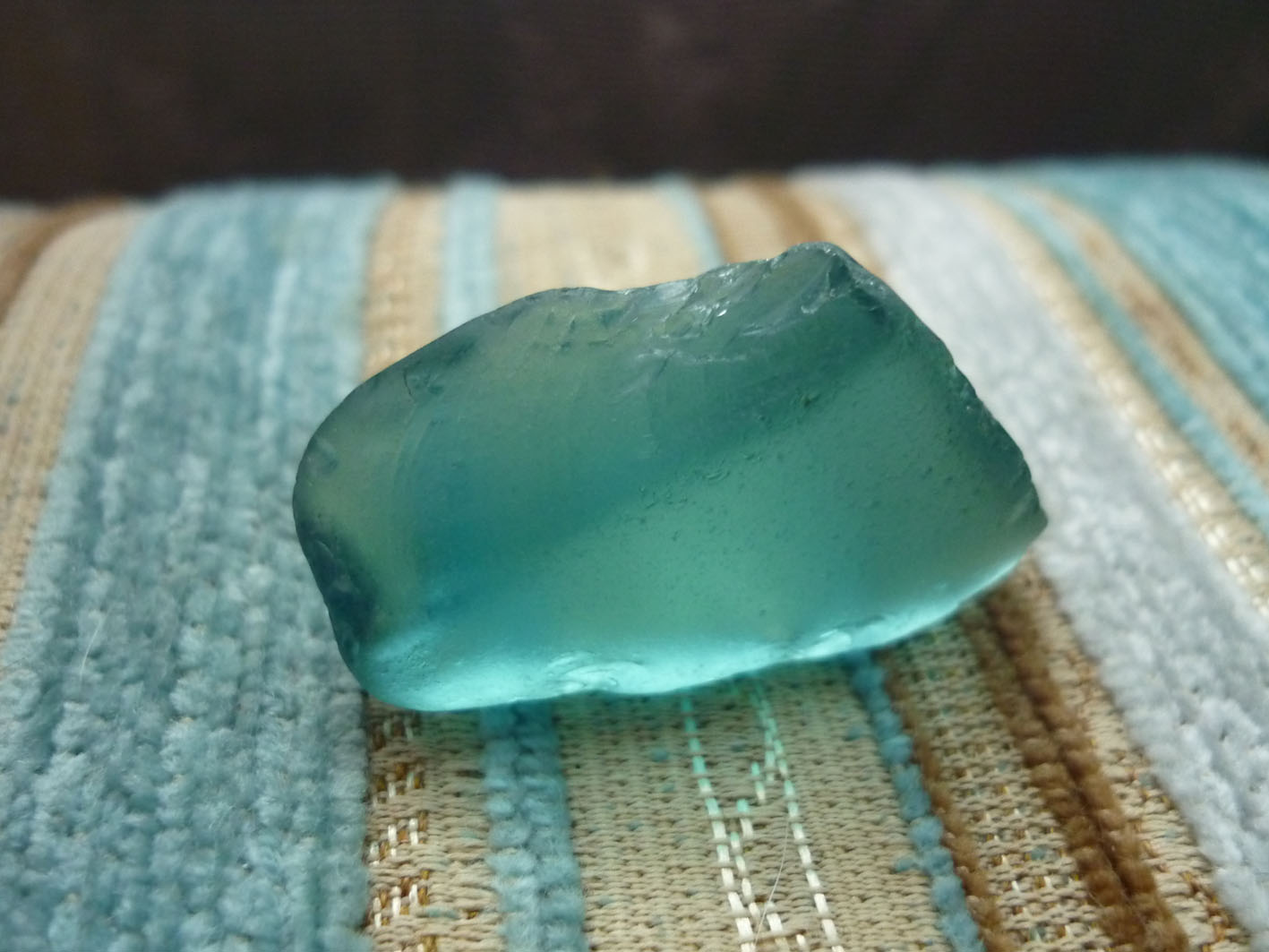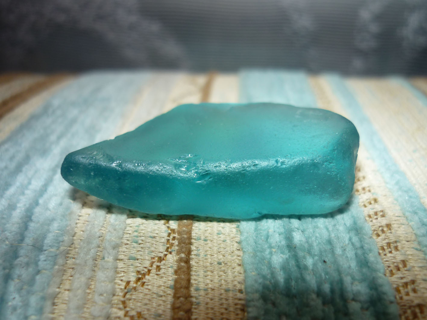 Этот камень несколько лет назад привёз с Курильских островов мой брат. Прозрачный зеленовато-голубой камень. Стекло поцарапал, но на том месте, которым царапала, появился белый порошок. Видимо, в процессе он и сам крошится.