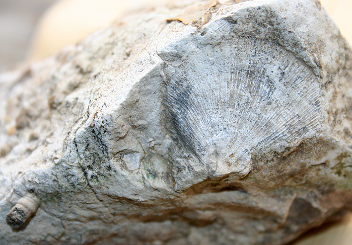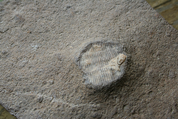 ж. Брахиопода. Края и центральная часть крыловидной раковины покрыты многочисленными тонкими ребрами. Cyrtospirifer verneuili (Murch.), позднедевонская эпоха; Намюр, Бельгия.