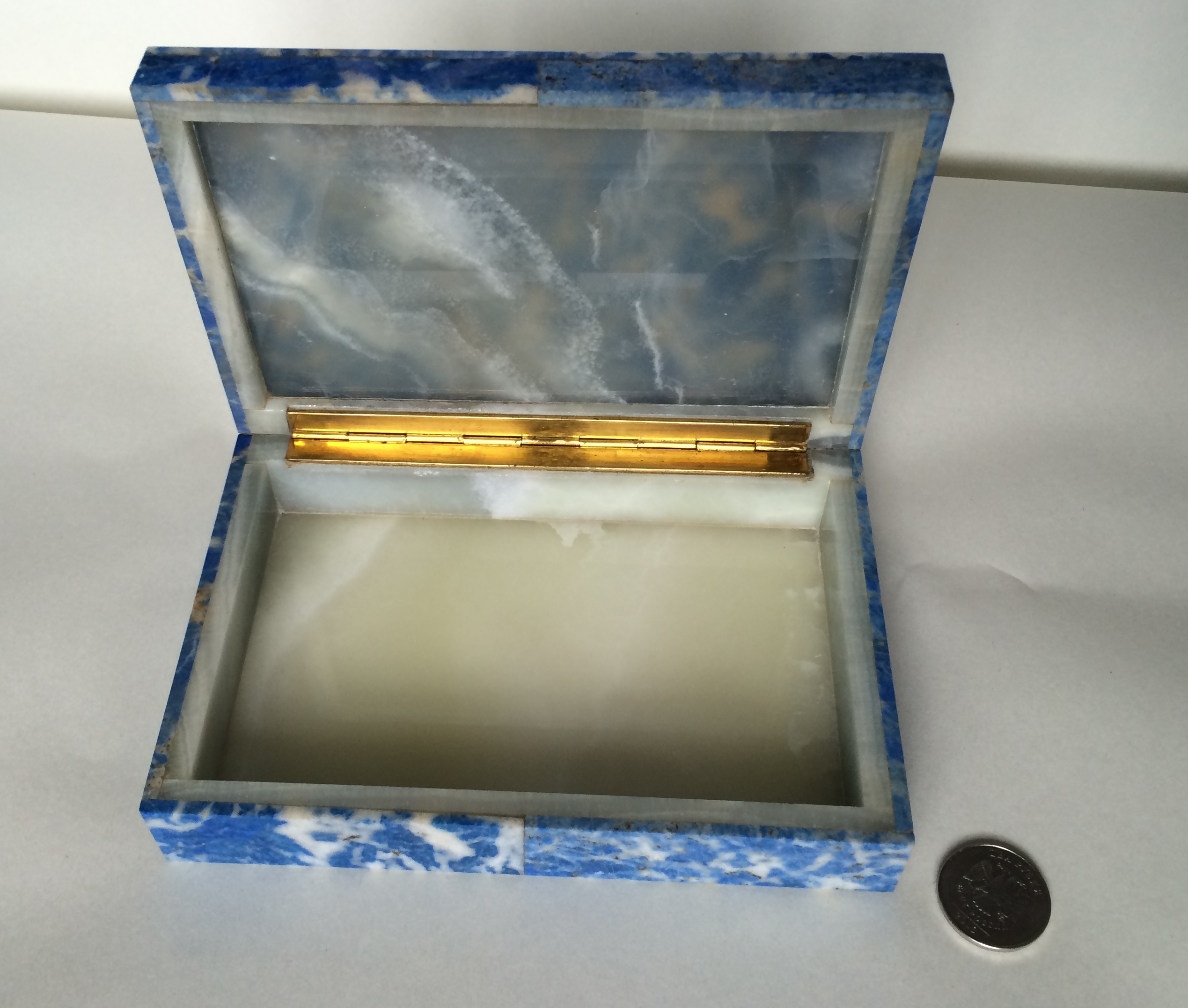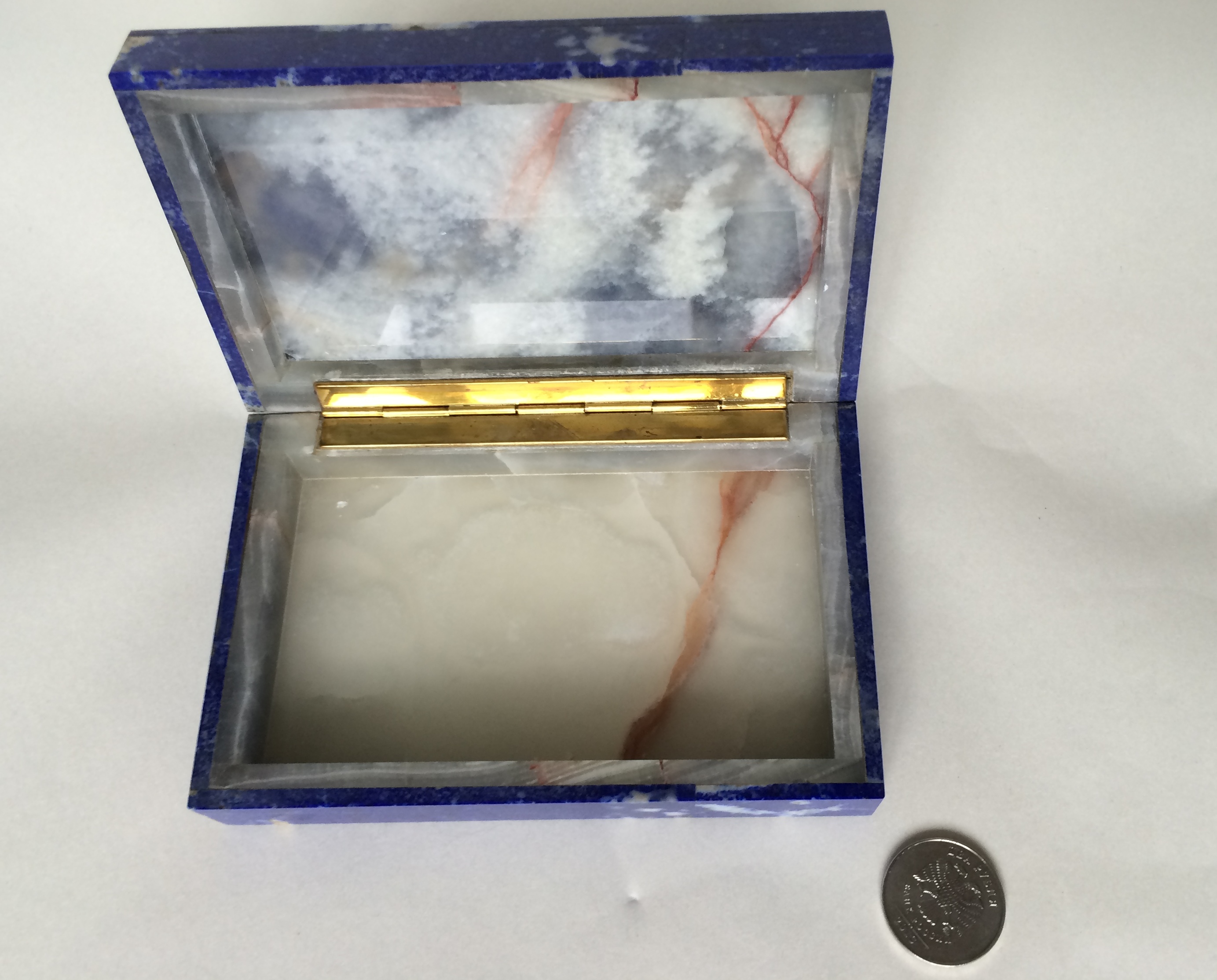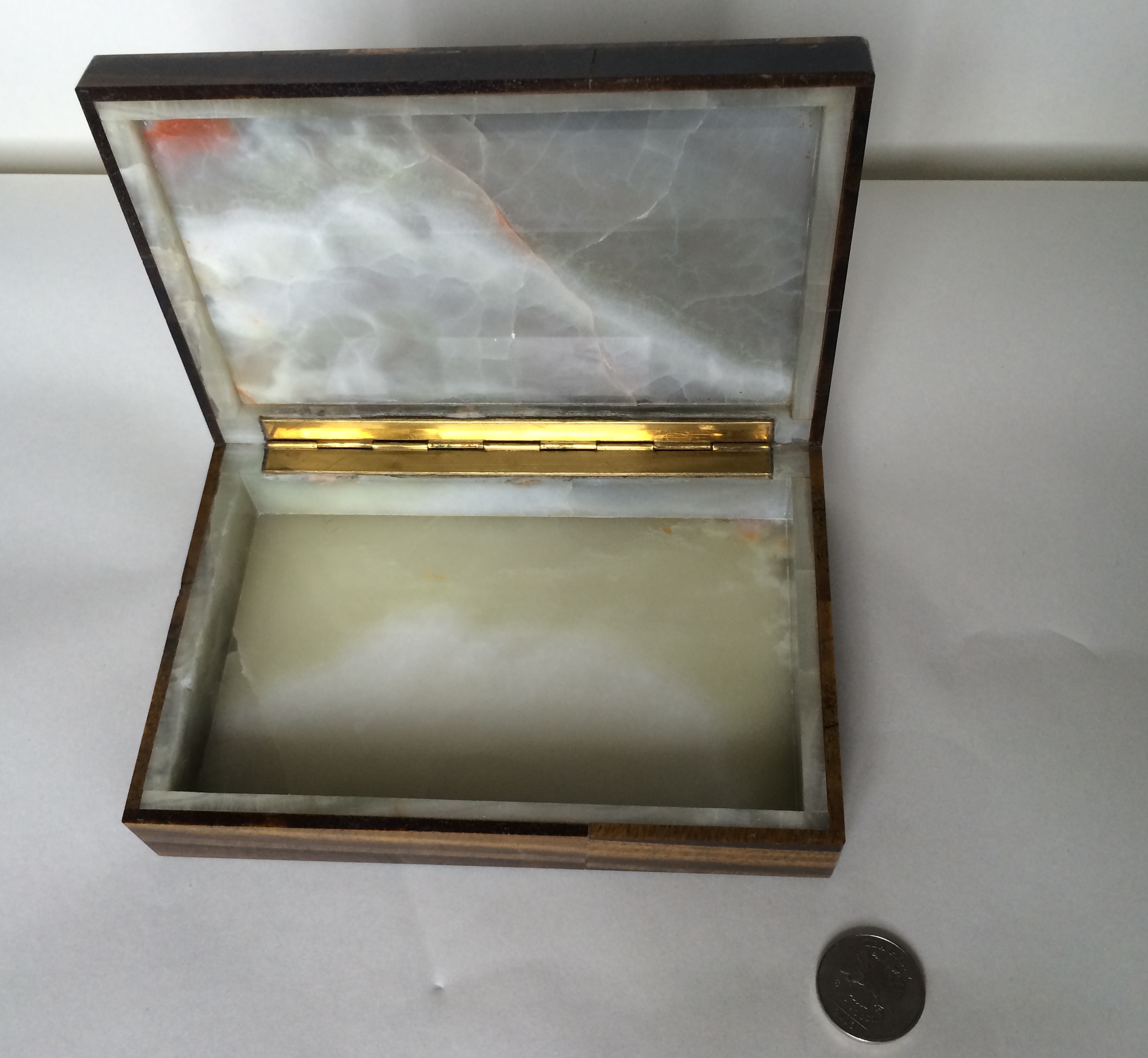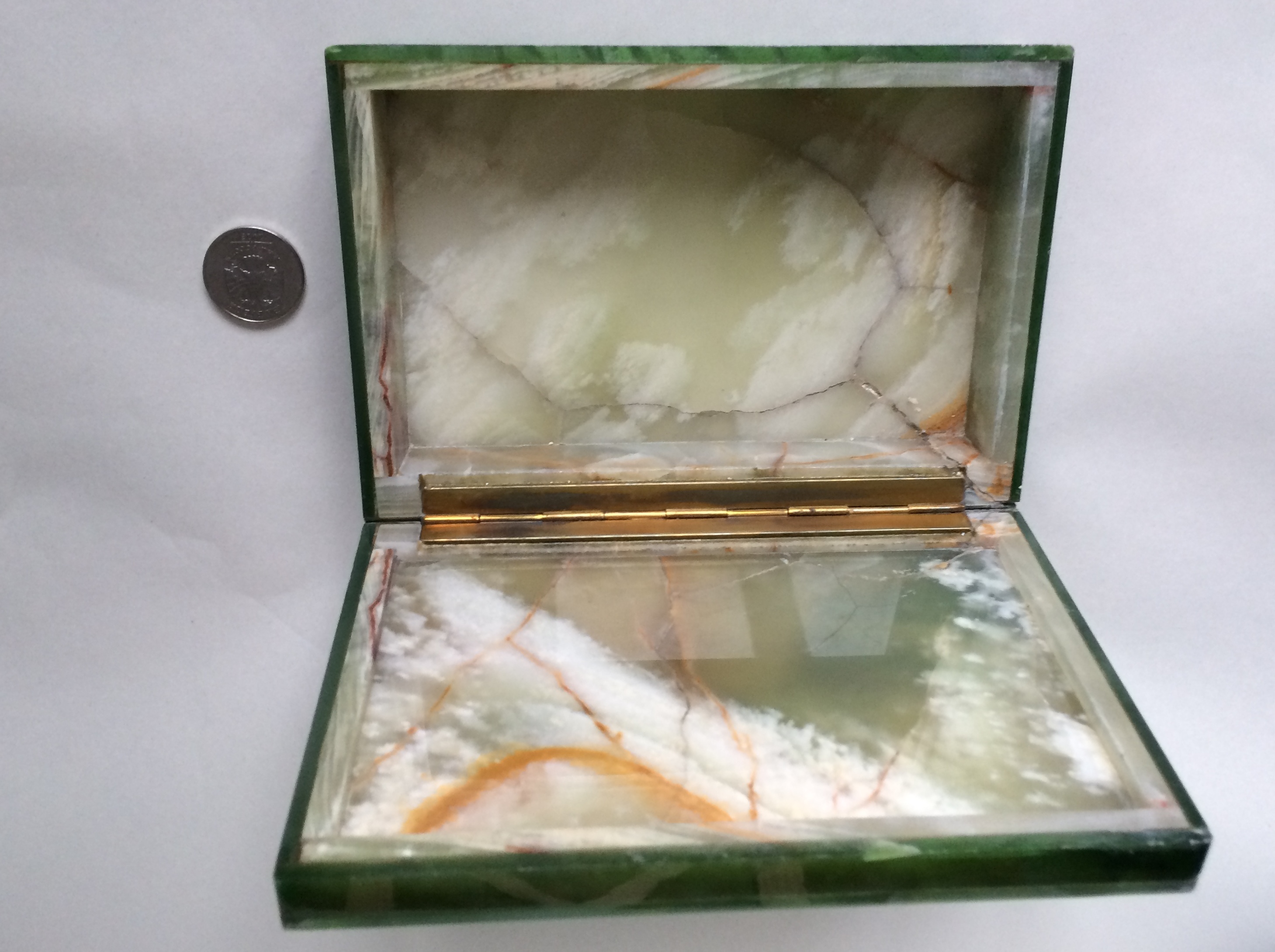 У меня несколько шкатулок сделаны так - снаружи цветной камень, внутри какой-то бело-прозрачный. Видимо в те года была такая мода. На оникс не очень похоже - уж больно прозрачный и без прожилок. Хотя может подбирали такие именно участки оникаса.