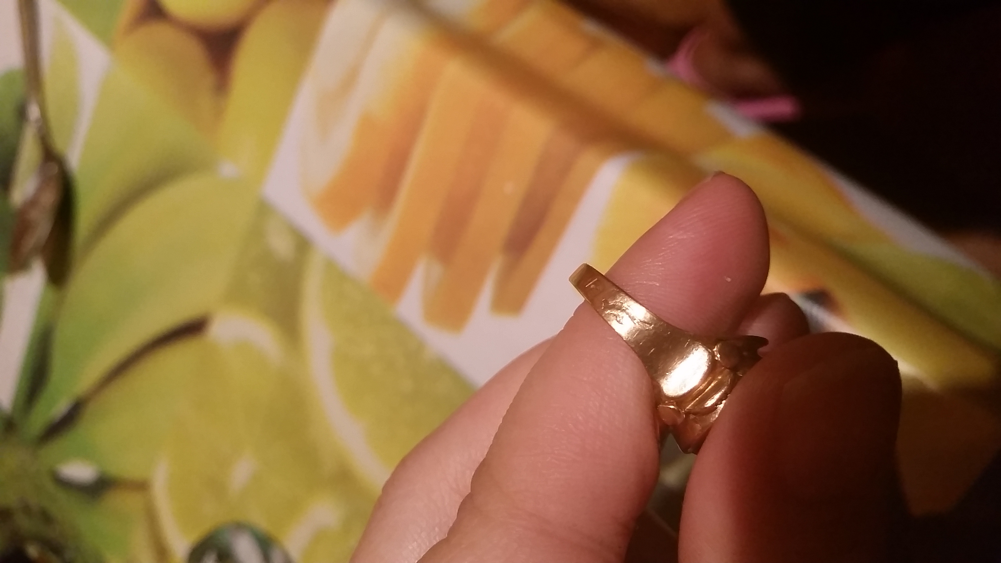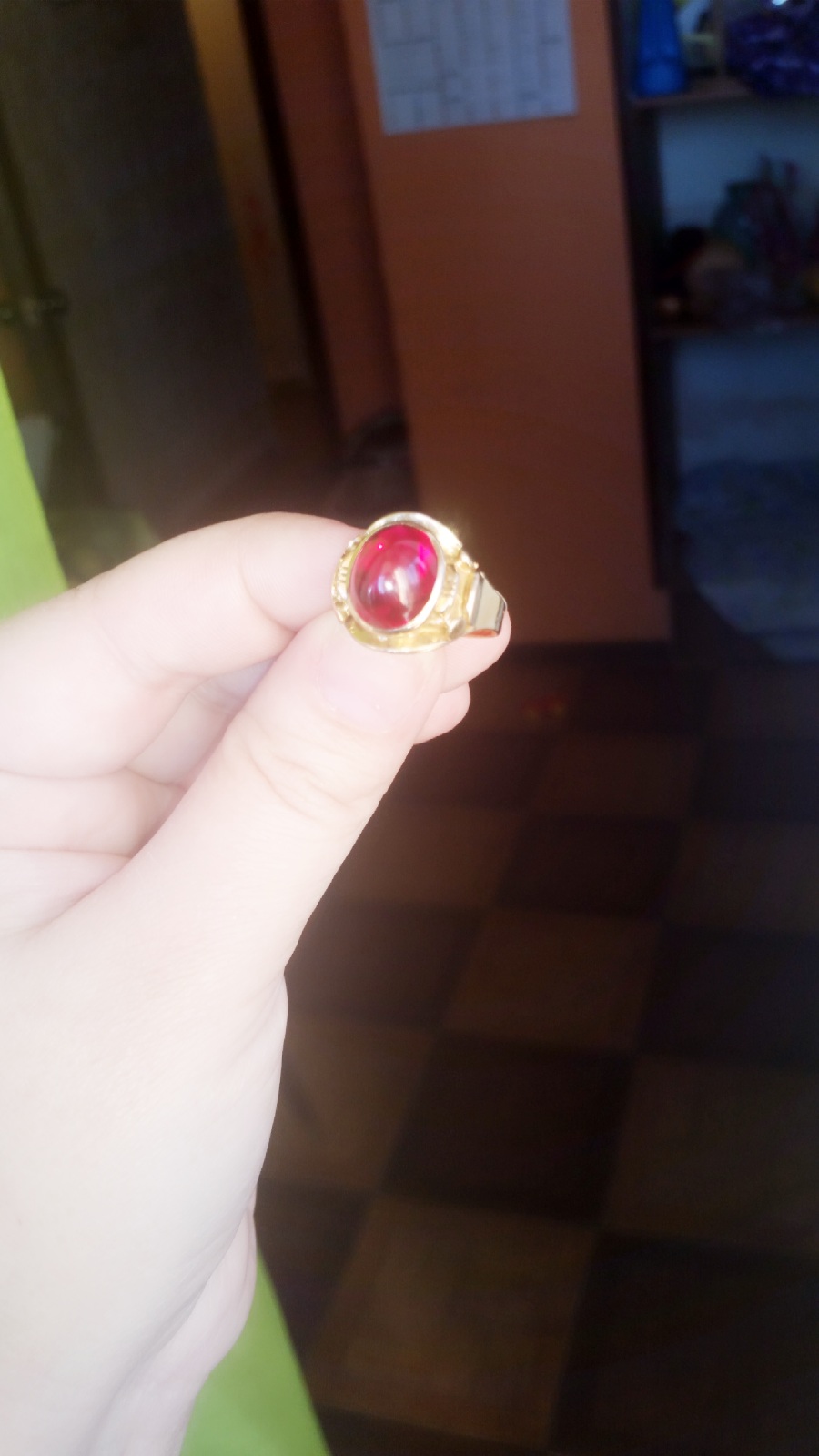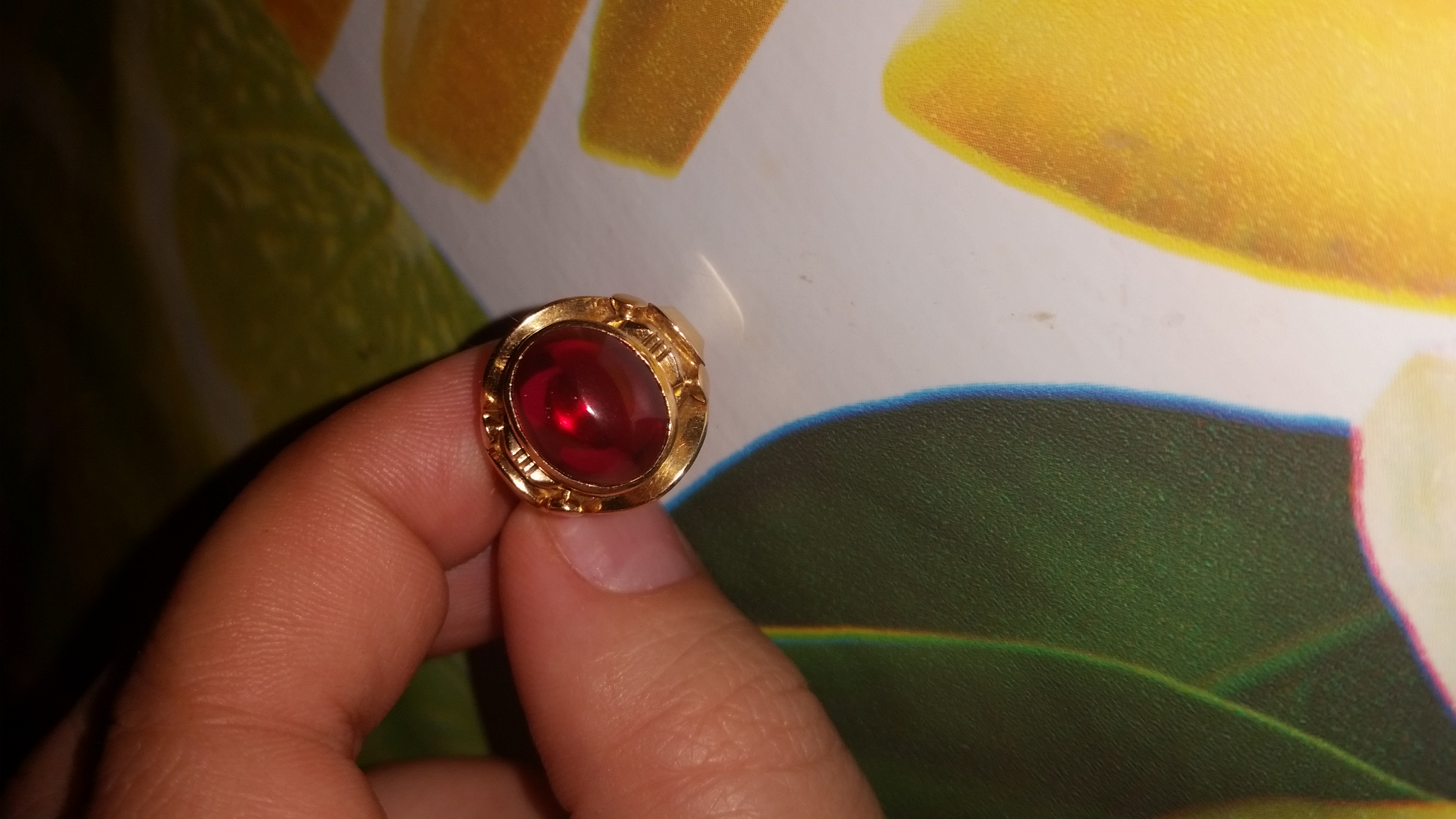Итак, унаследовала золотой перстень. Привезен был из Ирана, в советское время. Пробы нет. Есть персидская закорючка и римская VI. Кабошон выпуклый, чистый. Винно-малиновый (в зависимости от освещения ).