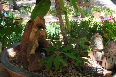 Первая попытка создать нечто peijing, поначалу композиция хорошо смотрелась, а потом щенок добрался до домиков и сгрыз крышу одной избушки, потом растения стали расти как ненормальные и приобрели гигантские размеры для пейжинга. Самое интересное - это камень, который является костяком композиции. Поначалу я думала, что это кремень такой дырявчатый, пришла одна знакомая и сказала что это явно не кремень. Теперь я в раздумьи: что за камень такой?