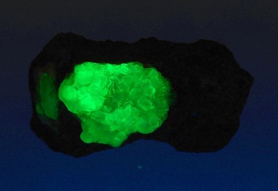 А вообще, именно флюорисценсция в минералах это явление очь завораживающее. Я даже вдохновилась, решила раздобыть uv-лампу и проверить свои сокровища, может тоже что-то будет светиться :) А пока, выставляю фотки из нета, тут флюоритик при дневном свете, и тот же флюоритик в свете uv-фонарика. И еще бесцветный опал-гиалит, бесцветный при дневном свете, но зато, какой сказочный, когда флюорисцирует!