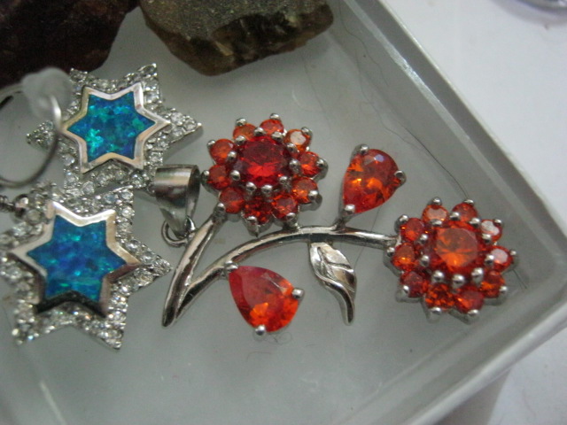 Подвеска из гранатов-спессартинов. Тоже не совсем ясно натуральный ли камень. Но в принципе разные они по цвету. В камушках есть включения, так что можно надеяться, что это облико натурале... На заднем плане серьги из опалов. Возможно, тоже не натуральные, сложно сказать...