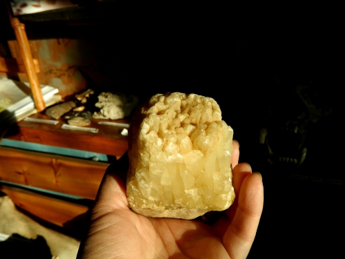 Саная, друза жёлтого кварца(?) напомнила жёлтый тюльпан или громадный жёлтый подснежник. Очень красивая друза! И общий снимок понравился: друза, ласка человеческой ладони и тепло дерева.