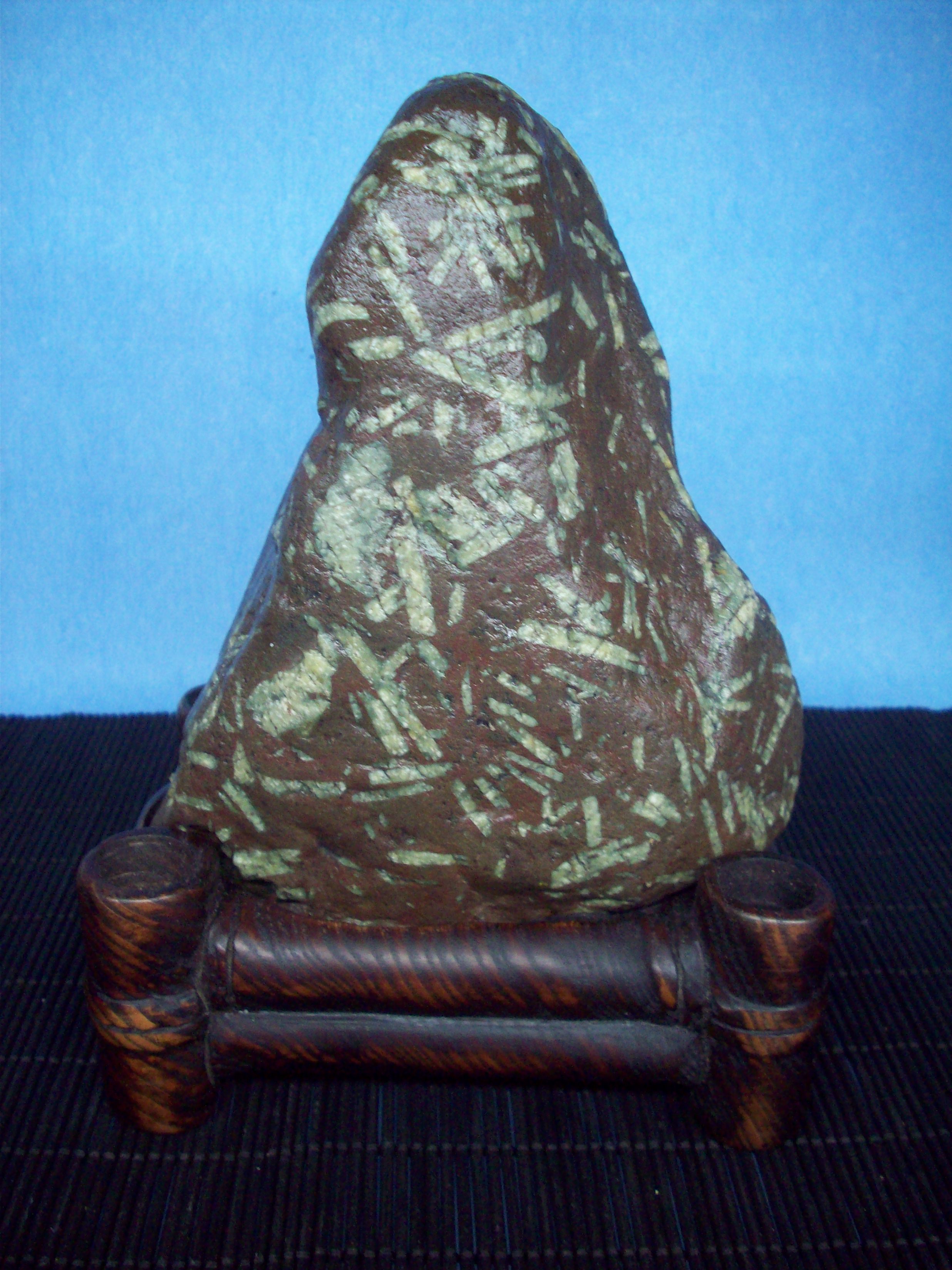 Я, к сожалению, не знаю название этого минерала, он довольно распостраненный и у нас и в Китае. Как правило, экспонируется как камень травы или бамбук-камень. У этого образца сложная форма (поэтому и такая немного громозкая дайза). У меня есть ещё пара таких камней, но они менее яркие и красивые. Пару подберем в этом сезоне. :)