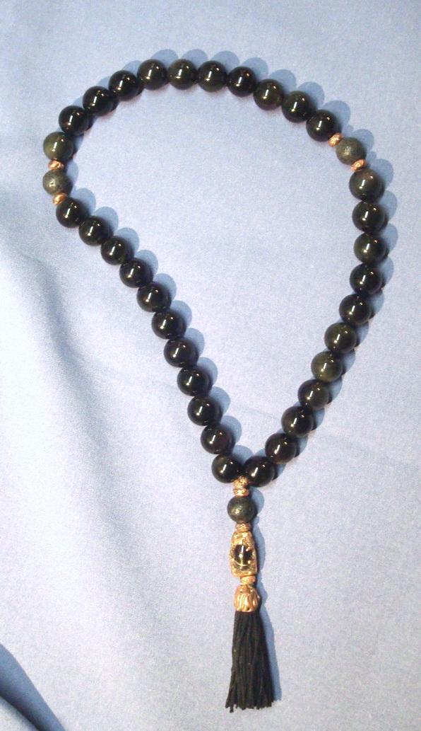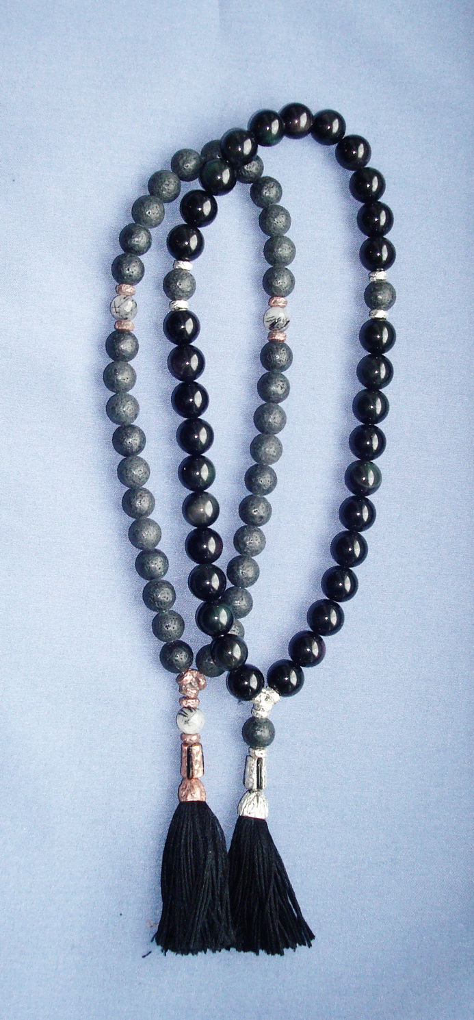 Чётки: обсидиан иризирующий, серебро,; лава, медь. Фурнитура ручной работы, инкрустация минаретиков - чёрный коралл.