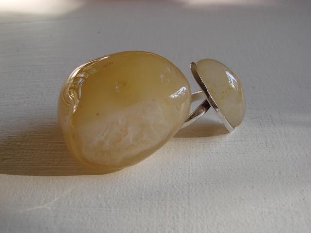 А тут интересный случай. Моя старшая сестра -заядлая рыбачка и у нее была возможность порыбачить где то на севере Якутии,чуть ли не на Колыме. Во время рыбалки шли по берегу галечному реки и тут увидели что берег тот не простой, а весь усыпан разноцветными камешками. Она собрала кое-что и мне сделала вот такой подарок: халцедоны с галечного пляжа далекой северной реки. Кварц этот я отдала на обработку и попросила ювелира сделать перстень.Вы его видите на снимке. А большенький кварц откуда то из ЮАР точно такого же цвета мне тоже подарил один замечательный человек, увидев на моей руке перстень с колымским халцедоном. Удивительно что халцедоны из разных точек нашей планеты выглядят так одинаково.