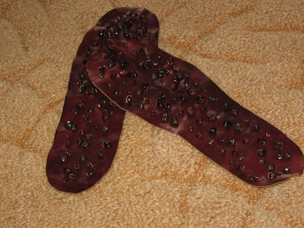 Вырезала из кожи стельку по размеру ноги и прямо на неё нашила грасные гранатики. В ход пошли и полированные и дикие кусочки.