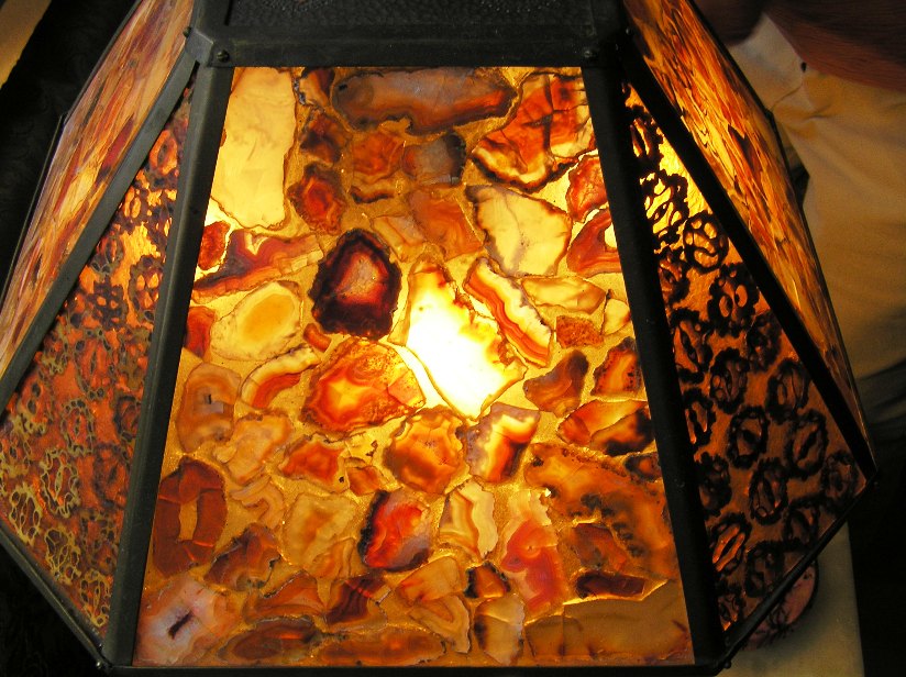 Из медной проволоки сделать каркас для абажура и на него на леску подвесить янтарные бусины. Только не над лампой, а сбоку от неё. В светильник поставить матовую лампу.