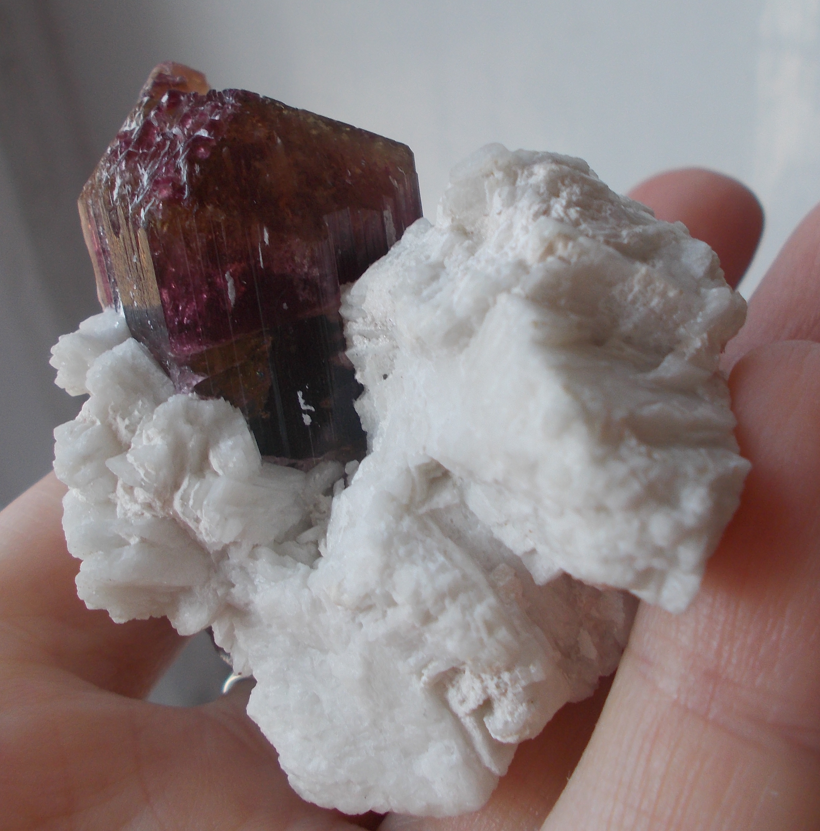 Шикарный крупный полихромный кристалл турмалина в альбите с прозрачной головой, 60*45*35 мм, Малхан, Забайкалье!! продан