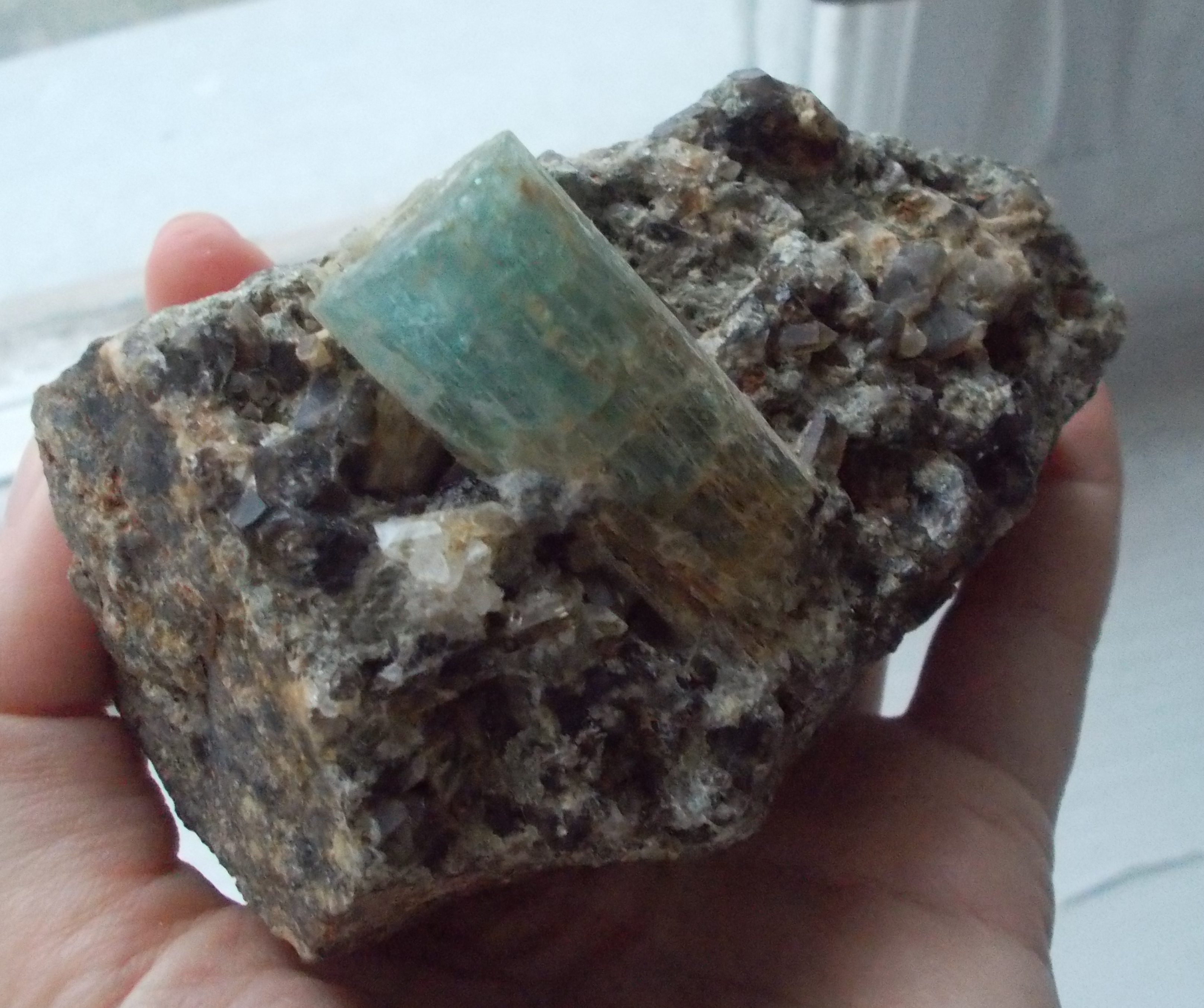 Шикарный кристалл просвечивающего аквамарина на мелких кристаллах дымчатого кварца. Очень красив!! Размер образца 100*60*60мм. Размер кристалла 40*20*20 мм . Шерлова гора, Забайкалье. Он действительно шикарен!!!)Делюсь, потому что у меня еще есть