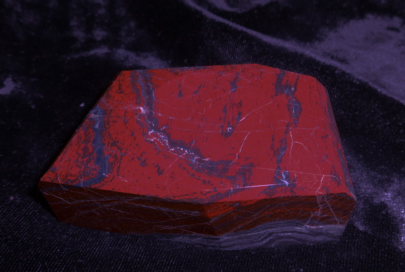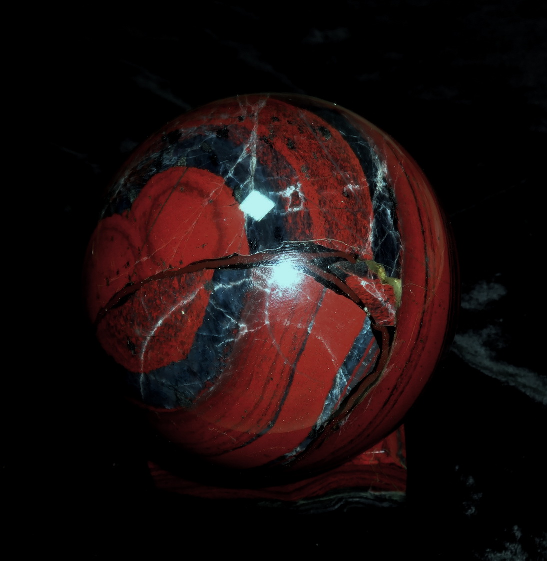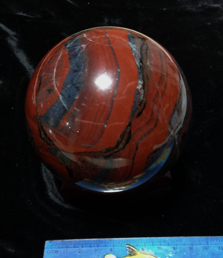 Яркий джеспилит с очень широкой красной полосой. Шар 9 см. диаметр, 1,45 кг вес. 1200 гривен.