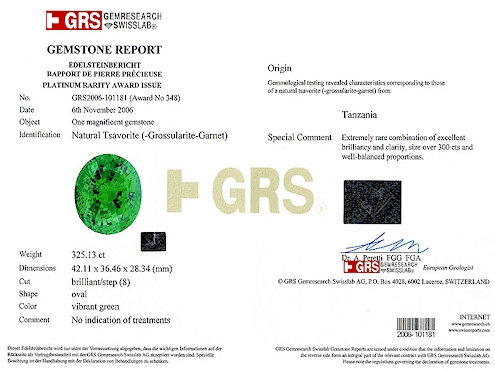 Уникальному камню повезло. В тот момент в Аруше находился доктор Ханни (SSEF Swiss Gemological Institute), который протестировал и засвидетельствовал существование рекордсмена.