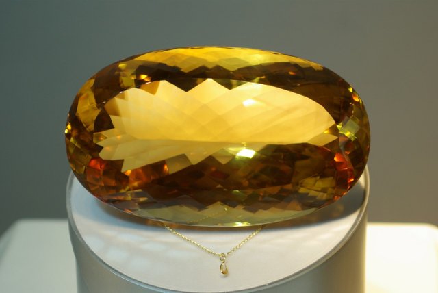 Самый большой в мире ограненный цитрин - Малага, вес 20200 карат. Его тазмер 25х20х15 см.