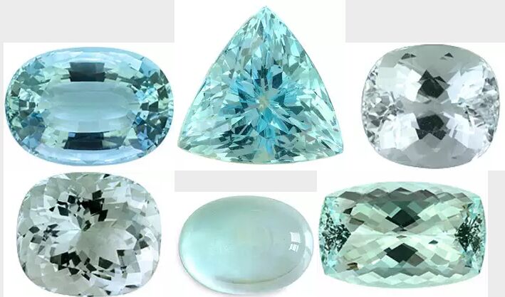Исторически наиболее ценным цветом аквамаринов считался довольно яркий, насыщенный зелено-синий цвет (цвет морской волны). В настоящее время в подавляющем большинстве на мировом рынке мы видим светлые ненасыщенные голубые камни. Отличающиеся наибольше интесивностью зеленовато-синего цвета аквамарины из нескольких месторождений приобрели свои собственные названия (Аквамарины Санта-Мария и Санта-Роча - по месторождениям в Бразилии; Санта-Мария африканская - мадагаскарские камни схожего оттенка). Аквамарины Санта-Мария (цвет наподобие представленного выше на первой фотографии), точнее сказать - не сами камни, а их название - стали предметами многочисленных "спекуляций". Так стали нередко называть что ни попадя исключительно с цель продать подороже..