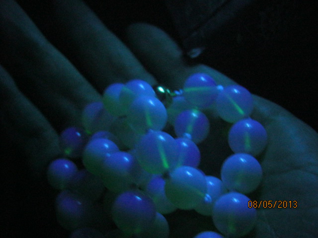 Реакция, прямо скажем, необычная. Некоторые бусины продемонстрировали среднее и даже сильное голубовато-белое свечение под длинноволновым УФ и слабое голубовато-белое свечение под коротковолновым УФ. Стандартной реакцией лунного камня (из серии ортоклазов) является от полной инертности до слабого свечения в синем, красном или розовом цвете под длинноволновым УФ, и от полной инертности до очень слабого свечения в красном, розовом или оранжевом под коротковолновым УФ, причём под КУФ свечение наблюдается очень редко.