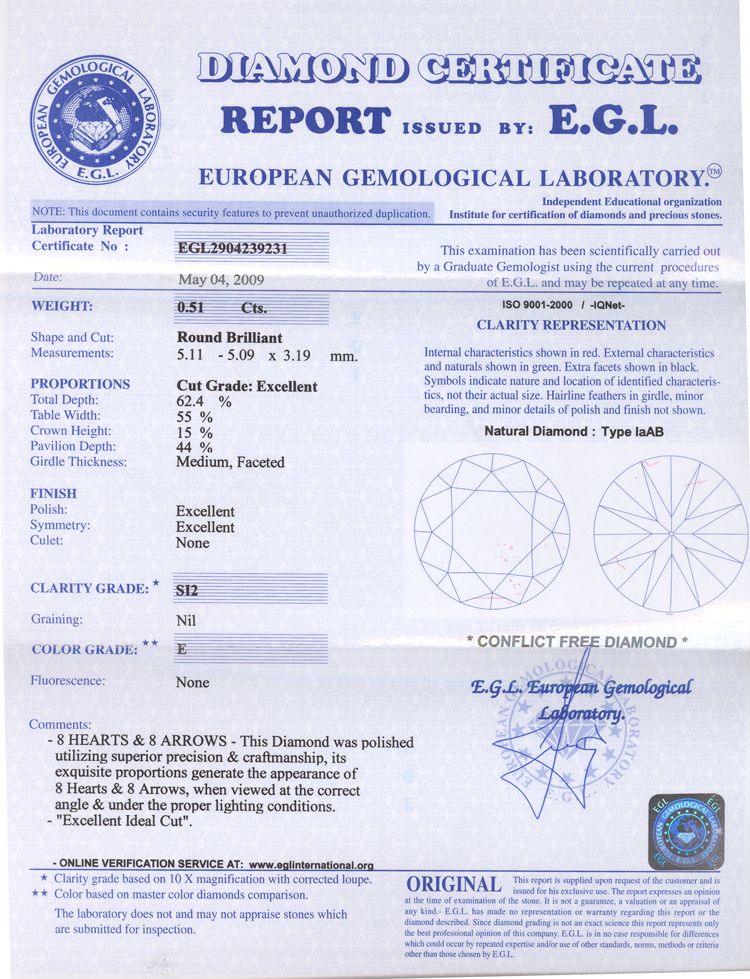 Гарантией того, что Вы покупаете то, что покупаете, может быть только сертификат всемирно уважаемых и признаваемых лабораторий - GIA, EGL, IGI, HRD, IGI, AIGS. GRS, SSEF и некоторых других. Их сертификаты не подделываются, имеют именные подписи эксперта, персональные номера, которые могут быть проверены через интернет. В каждом сертификате приведена схема расположения включений и описан их тип. В последние 10 лет большинство сертифицированных GIA бриллиантов весом более 0.5 карат имеют еще и лазерную гравировку номера сертификата, причем не на поверхности, а внутри бриллианта. Зашлифовать или подделатъ это невозможно. А сам сертификат по номеру и весу камня можно проверить через интернет.