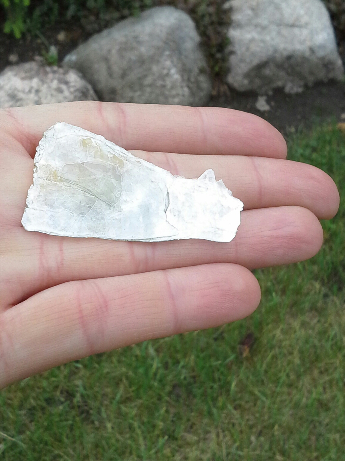 Прозрачный скол от крупного экземпляра. Причём, этот прозрачный слой был наростом на совсем отличной породе (на чём именно не помню. Я тогда не думала, что это будет важным в определении). Хрупкий. Слоистый, как торт "наполеон". Иглой легко оставила след.