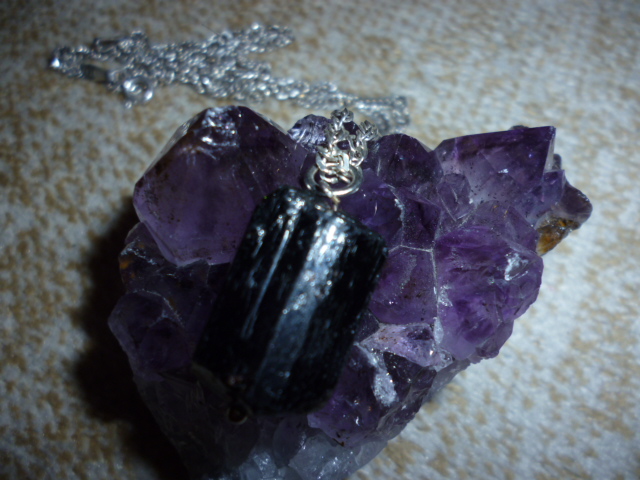 Да, у всех разные кулоны... и такие прям красивые. У каждого человека свои любимые, особенные... Вот кулон из шерла я таскаю уже достаточно долго. Как только я возьму какой-нибудь другой камень для работы, у меня тут же голова начинает кружиться, если я с шерлом... Хочет быть единственным у меня. Ревнует что ли? Эх, приходится снять... Вот он мой кулон. Мне кажется, за счет его свойств заземления я перестала чувствовать щитовидку. :P