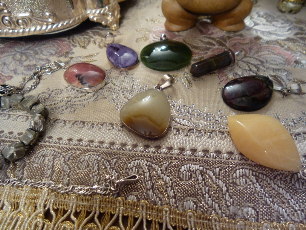 кулон, собственно, один только. круглая плоская бусина серого агата на шнурке. как кто-то писал выше - "не люблю одетые камни". я вот тоже.., также. камень прижился. куплен был в Иерусалиме за какие-то смешные копейки, красивый, да..., но хотелось чего-то более яркого, не помню даже, почему так. а вышла - с агатом в ладошке. есть некое ощущение того, что - оберегает и учит. может, оно и кажется мне, но вот, будучи мамой ребенка-инвалида (любимого и замечательного), для которой терпение - необходимость ежедневная, как-то вот... чуется.