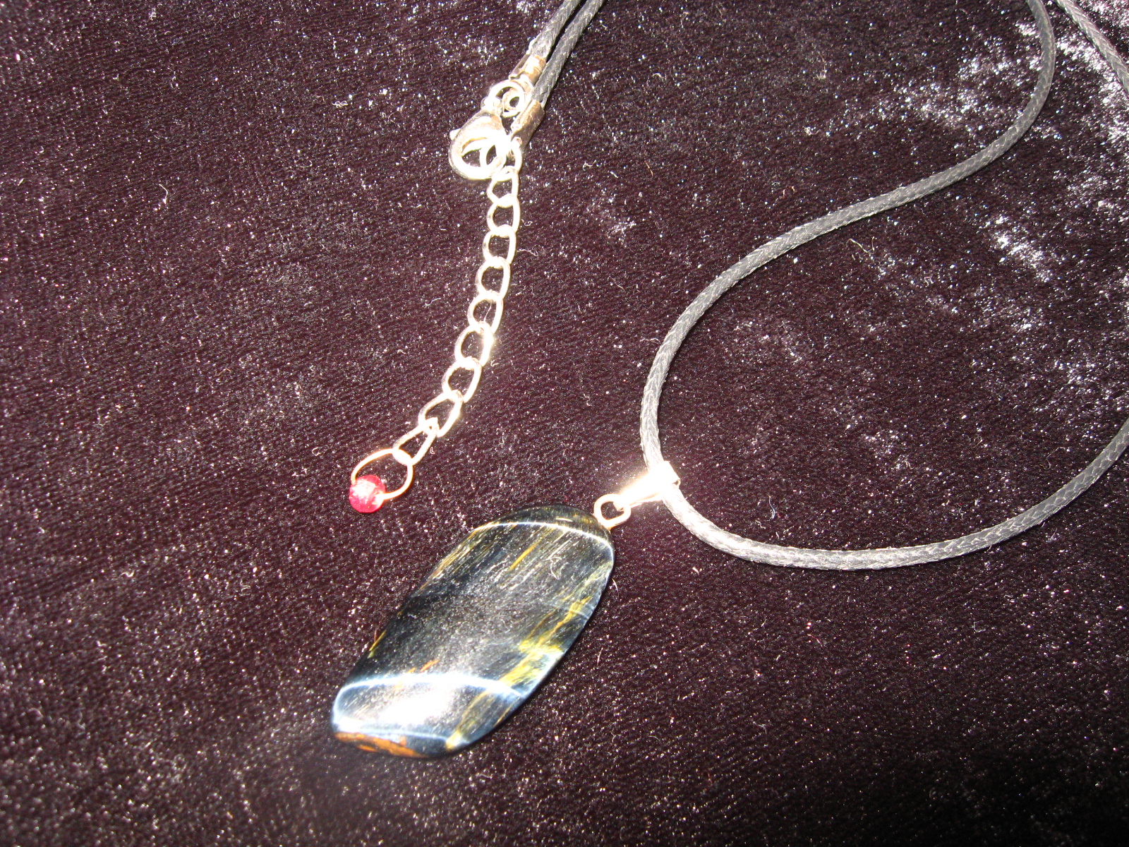 Один из рубинчиков надела на застежку шнурка, на котором был соколиный глаз. Получается спереди соколик, а сзади на затылке - свисает маленький рубинчик. Эффект просто ошеломительный!