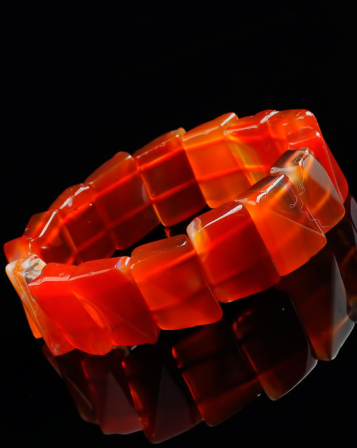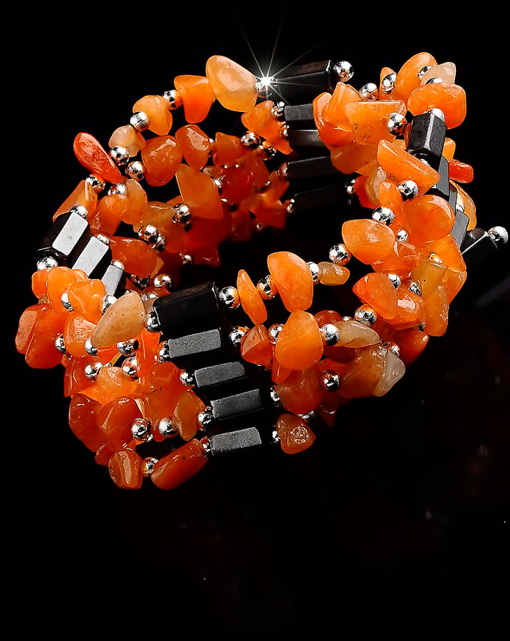 Если брать браслеты - то магнетит (а под его видом видом вам продадут набор магнитов) я бы не рекоменндовал. Сердолик будет уместней. Можно эксперементировать с аметистом, гагатом, шунгитом, изумрудом (зелёные разновидности берилла), зелёной и красной яшмой, возможно с бирюзой и лазуритом...