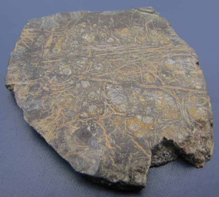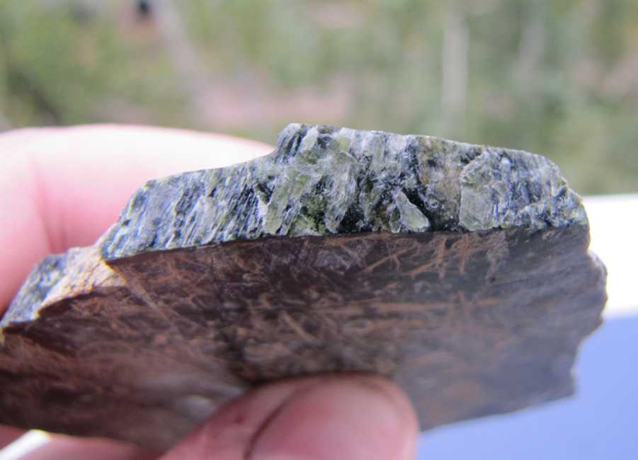 Господа, были мы тут в выходные в Башкирии, ну и насобирали камней. Сегодня один распилил, и вот что внутри. Подскажите, что за зверь? Поначалу диск не берёт примерно миллиметров по 5-6, далее - как по маслу. По строению напоминает чароит.