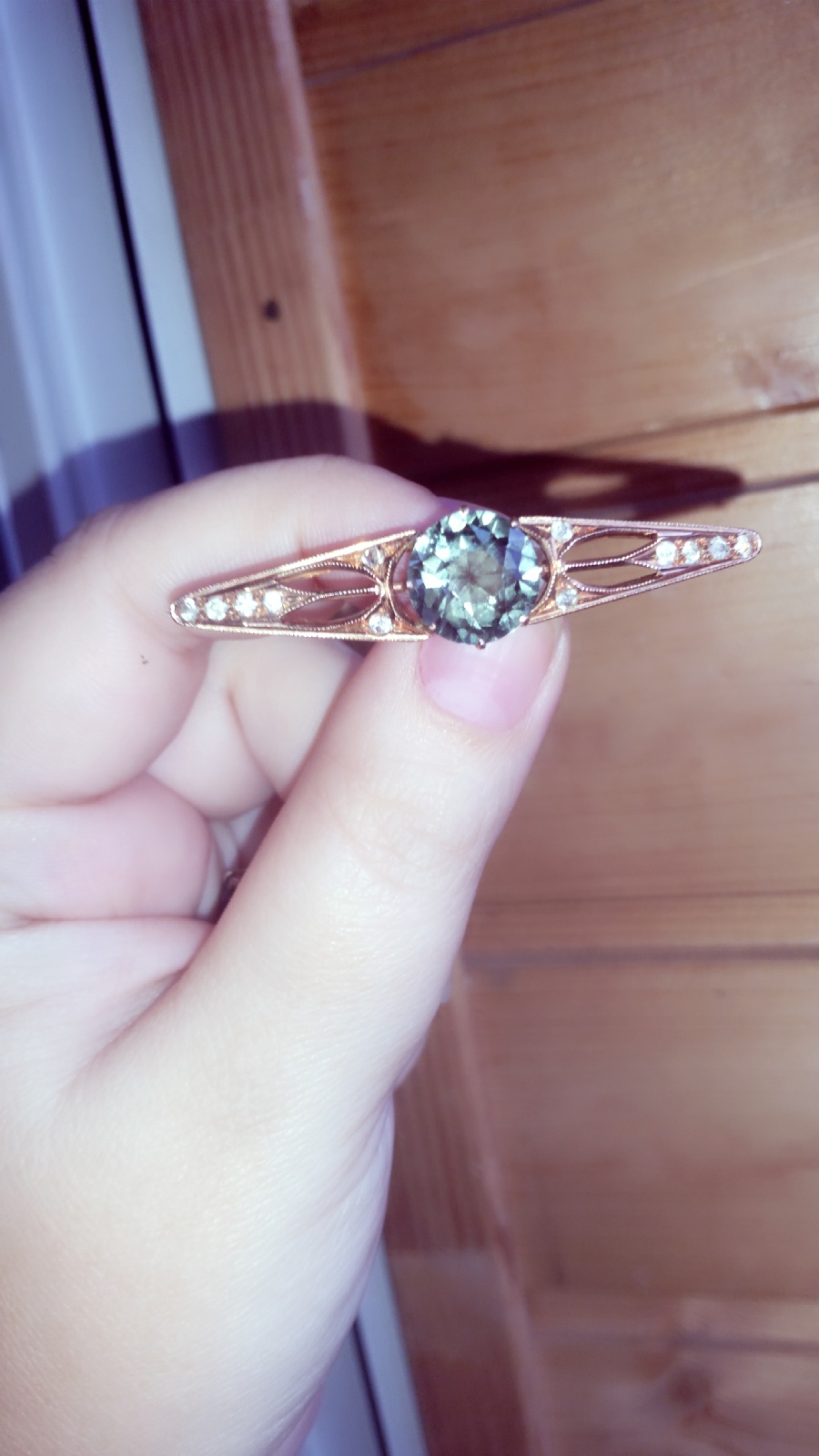 Свекровь подарила брошь своей пробабушки. Вещь старая, скорее всего начало 20 века. Мелкие камни - бриллианты. Главный камень при электрическом свете - синеватого оттенка, при дневном - нежно-зеленый. По мне, похоже на аквамарин. Но меняет ли он так цвет? Очень интересно Ваше мнение.