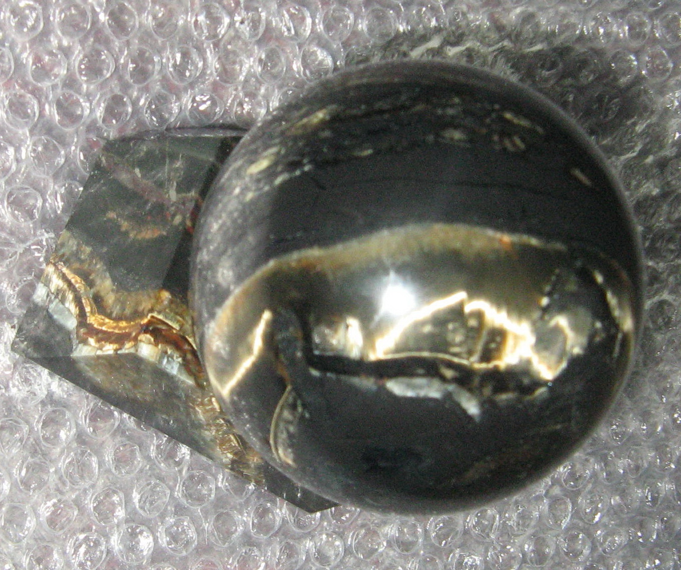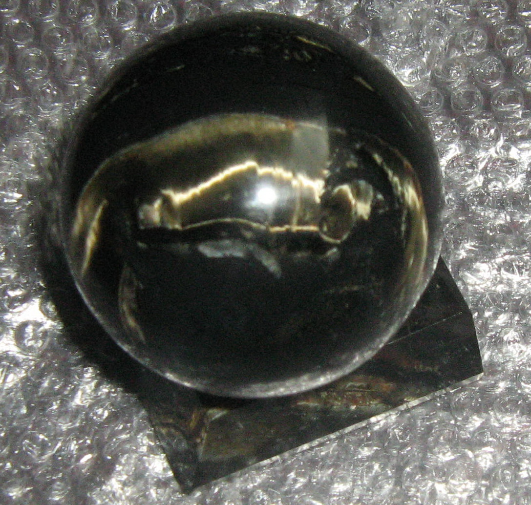 Такой "кошачий глаз" они называют кварцевым. Это знаменитые железистые кварциты Криворожья. В данном случае эффект глаза дают сероватые волокна крокидолита-асбеста. У меня тоже был такой шар.