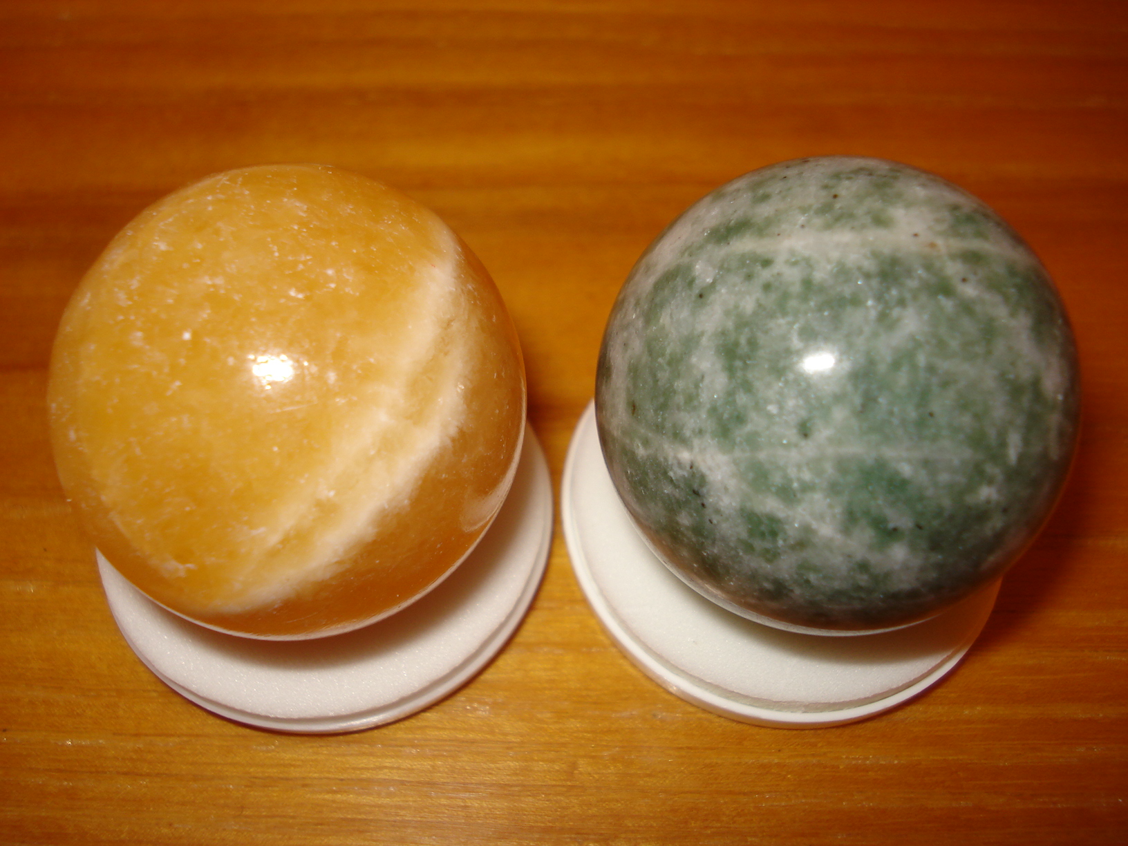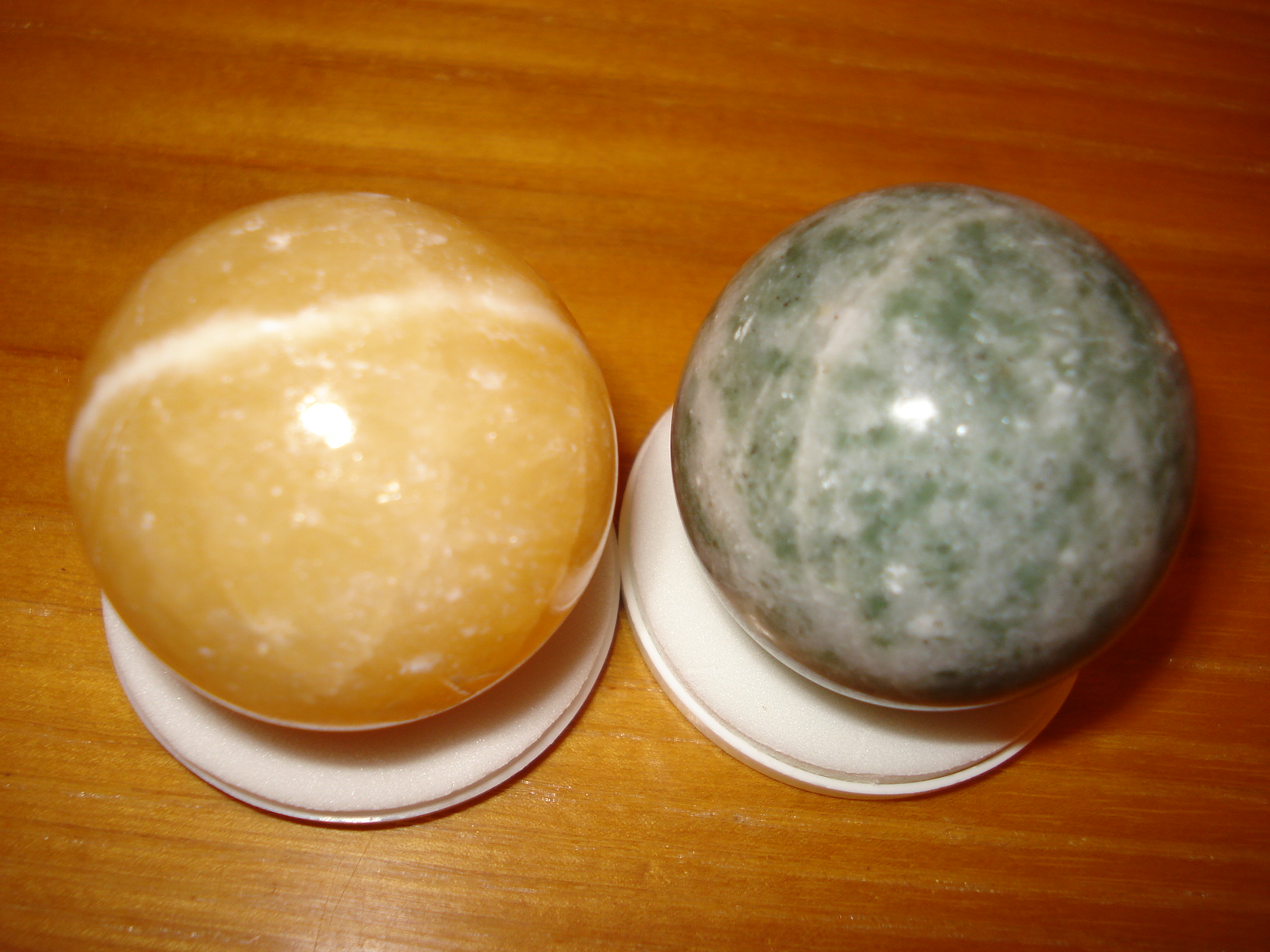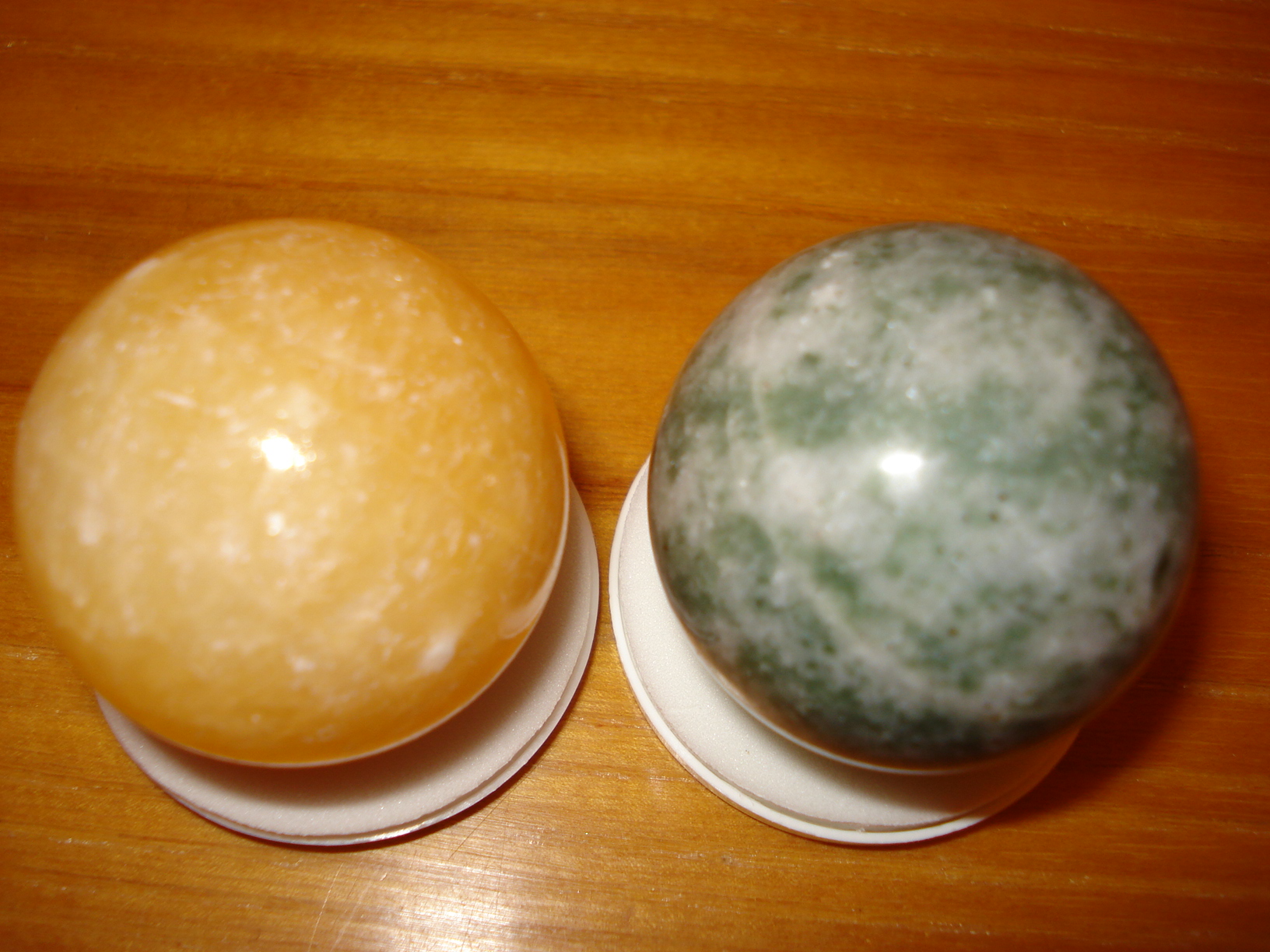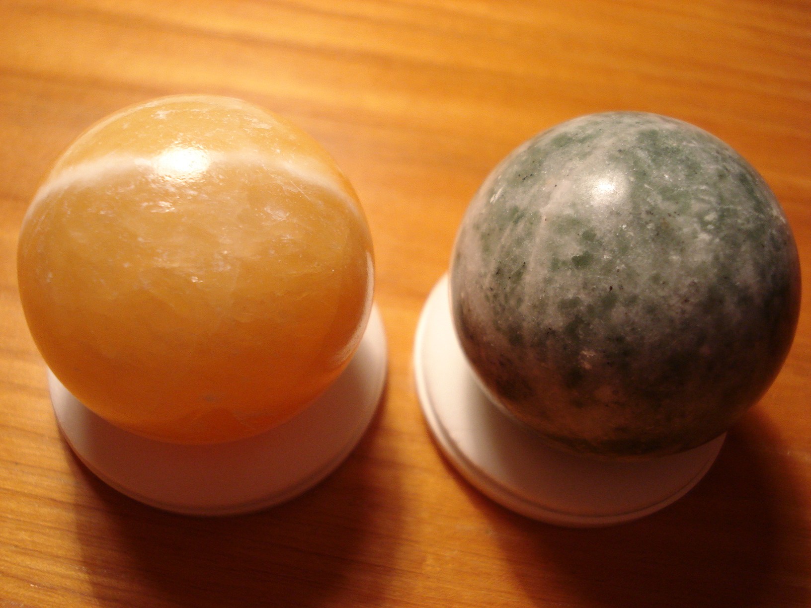 Большой привет Шери от моих новых шариков (37 мм). :bye: :jokingly: И всем-всем-всем.)) :jokingly: Короче, есть у нас книжная база "Janus", там еще работает эта продавщица, про которую я рассказывала, как она изменилась... помните? :jokingly: Ну вот, у них давно уже ничего интересного, один мраморный оникс, но зато дешевле в Риге не найти. Ну вот, она мне сказала зайти в ноябре, будет привоз. Ну я и пошла. :jokingly: И, о чудо, появились маленькие шарики не только из оникса!))) Правда, они не подписаны, определяйте, мол, сами. :hahaha: Желтенький - кальцит, это понятно, такой цвет, как я хотела, у меня же и куски его тоже такие, "цыплячьи". :jokingly: А вот второй - что это? Продавщица предположила, что амазонит, но знания у нее в этой области самые минимальные. :hahaha: Царапать не буду! :P Чем-то похож на мою пятнистую собачку, но не совсем... Вот. ;)
