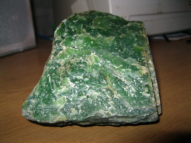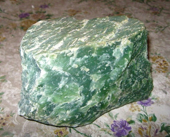 Здравствуйте, форумчане! :) Прошу вашей помощи в определении камушка. Я получила его в подарок пару дней назад. Сижу вот, думаю, что бы это могло быть: по внешнему виду и наощупь – похоже на нефрит. Поверхность у камушка как бы “жирная” и “липкая”, не знаю, как описать – но не такая скользкая, глянцевая, прохладная, как, например, у флюорита или аквамарина. Кварцем царапается, на камушке остается едва заметная черта с белой пьлью, но кварц при этом стачивается. :roll: Вес камушка – 2 кг.