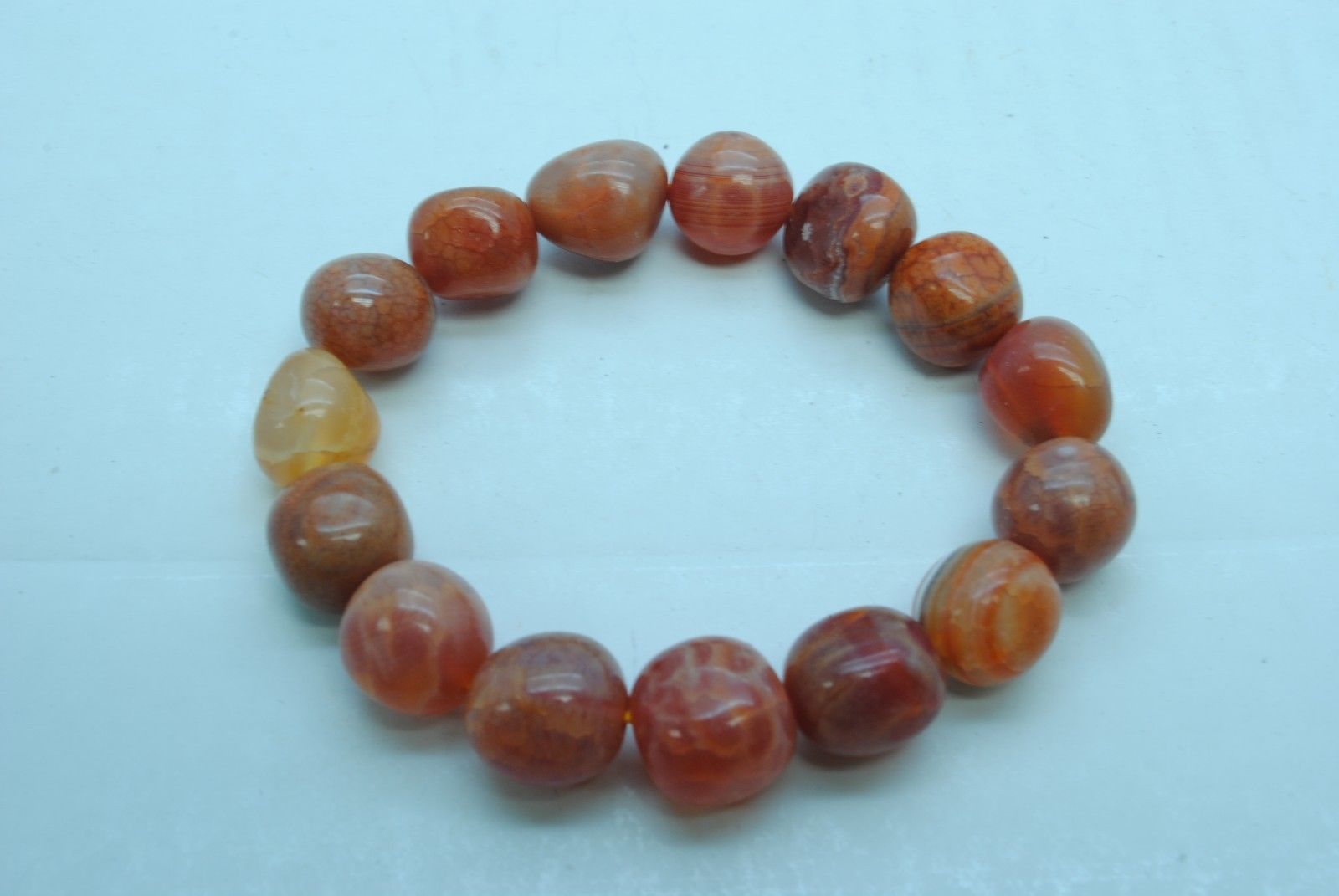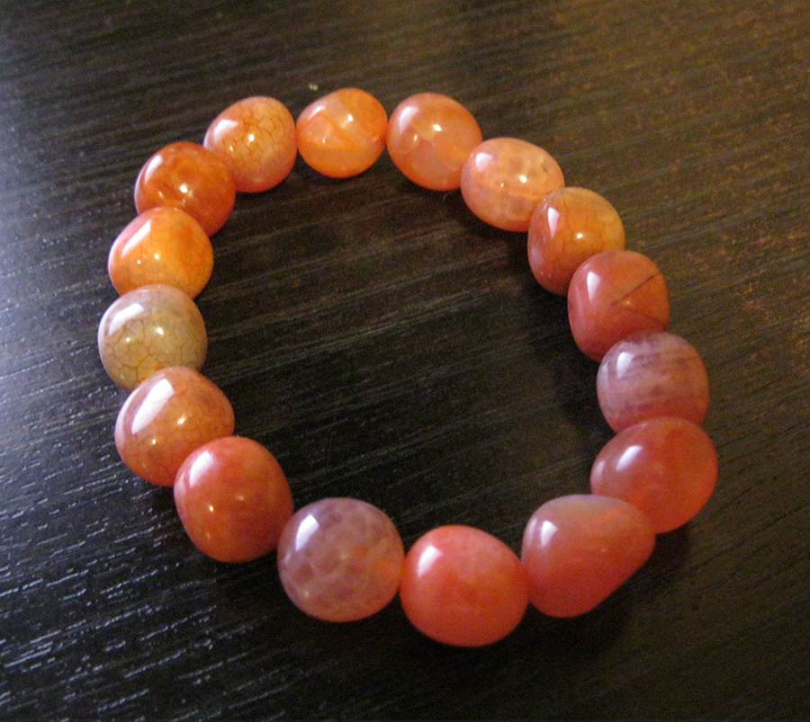 Заказал себе вот такой браслет. В качестве материала продавец указал огненный агат (Гренландия). Но огненный агат совершенно другой. И поискав в сети, вот что нашёл: " Агат кракле апельсинового цвета является натуральным камнем, цвет которого меняют в процессе окраски на фабрике по производству бусин из натуральных камней в Китае. Агат кракле получается путем сильного нагрева сырья агата и последующего погружения в холодную воду - так появляются характерные трещины - кракелюры на поверхности камня".
