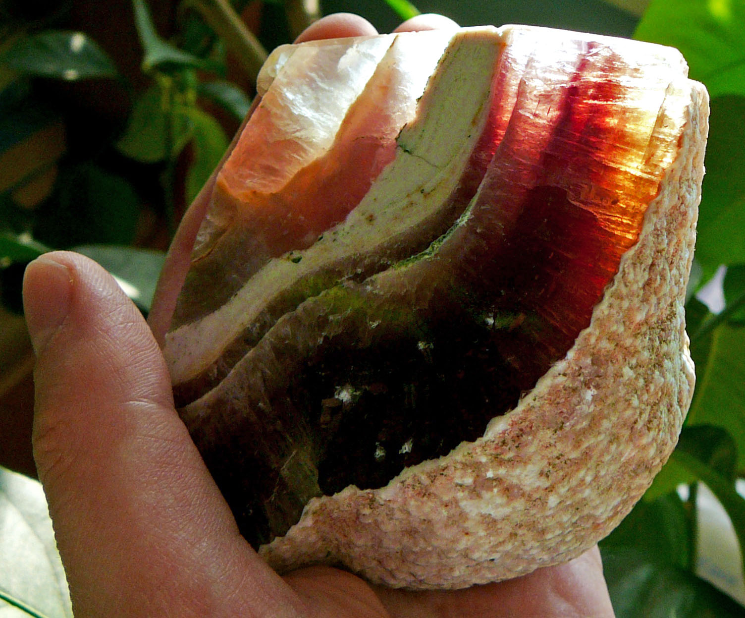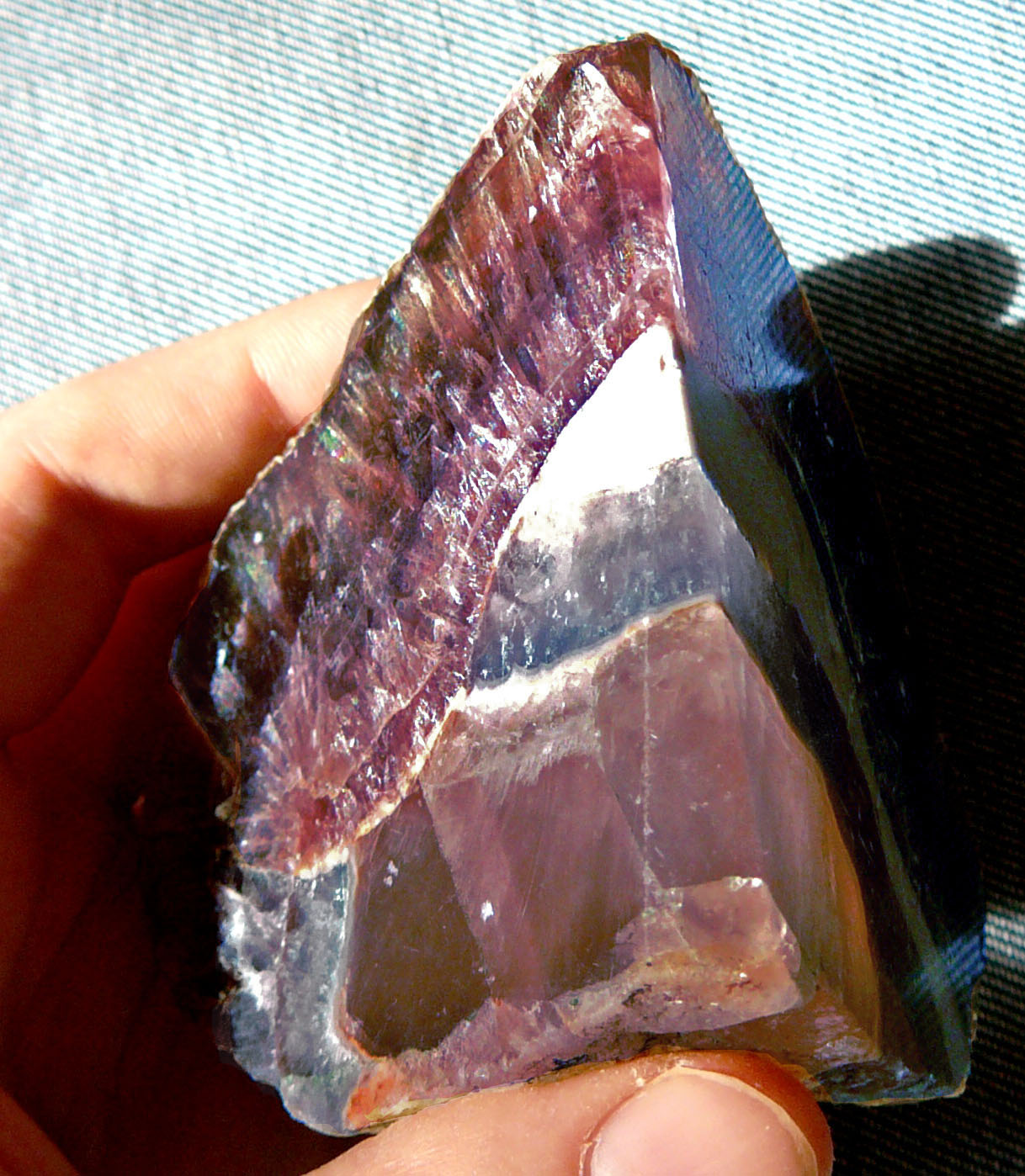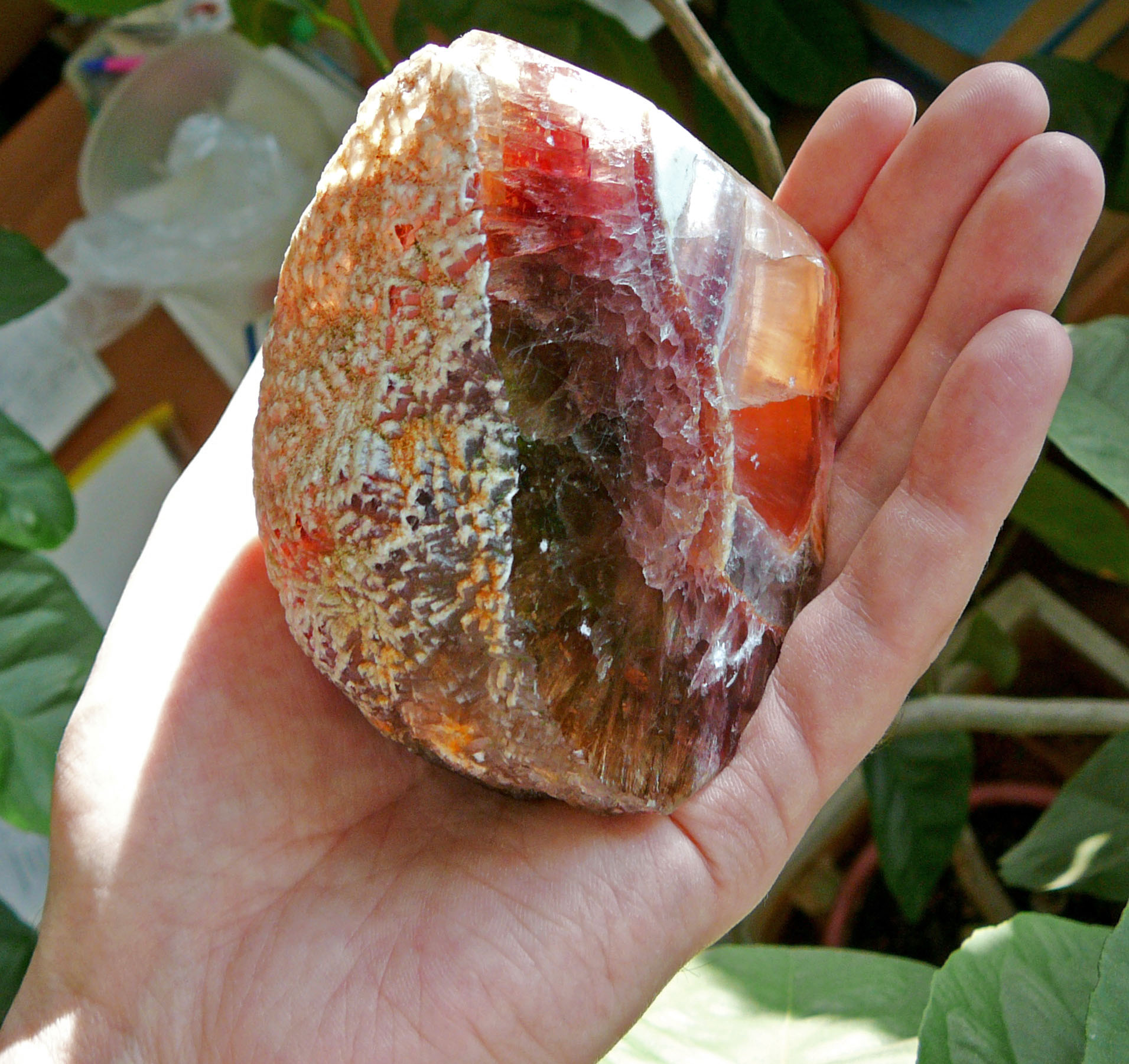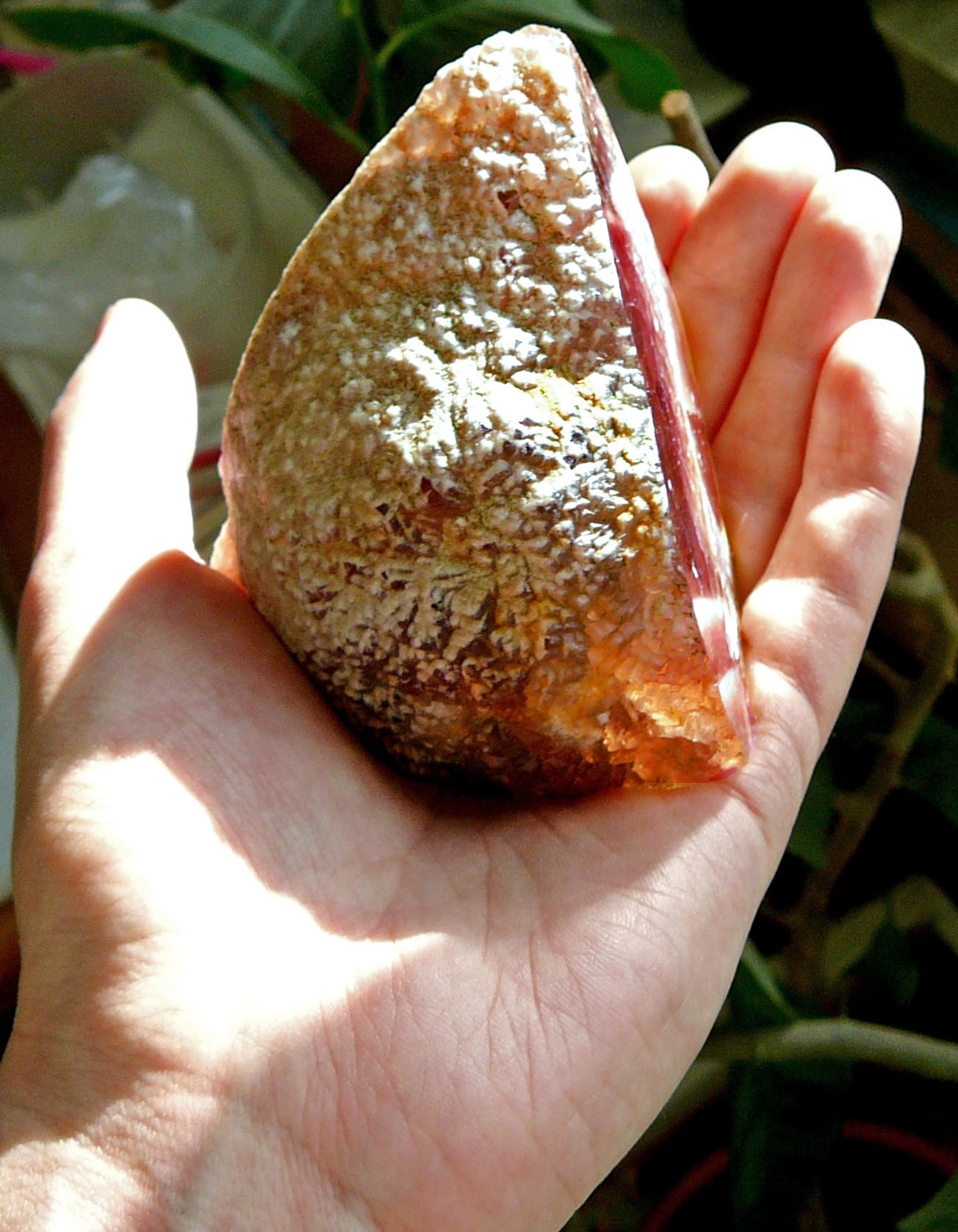 Камень, ещё интересен тем что хорошо видны вершины кристаллов в сростке и на свету видны контуры кристаллов в глубине сростка