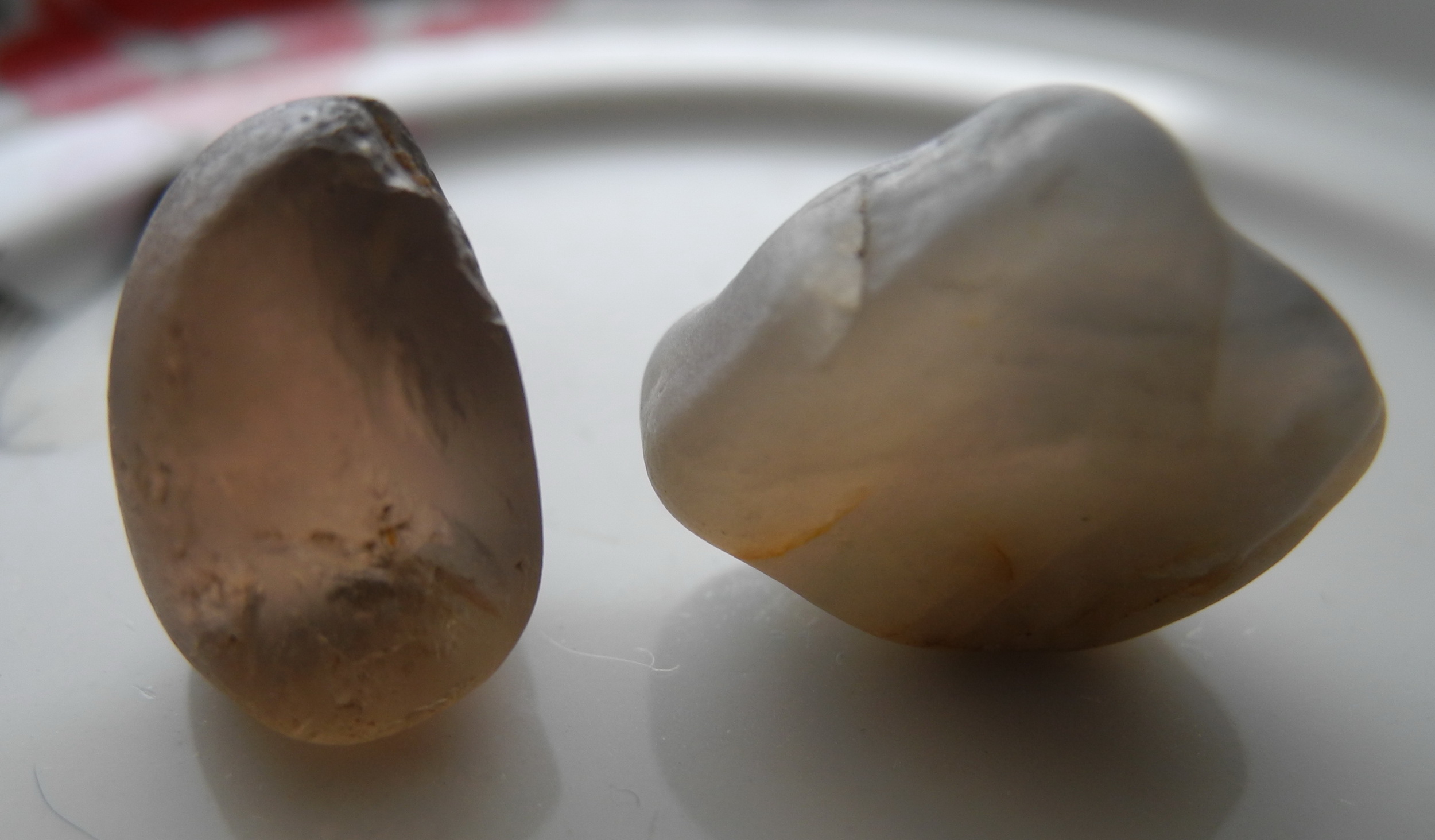Главное кратко -с правой стороны фотографий обломочек плоской гальки (не более 2см по длинной стороне, река Лена Якутия). Эксперименты с прозрачным кварцем, большой иглой, стеклом, сколами халцедона - по твердости определяют его как кварц. "Они" - имею в виду кварцевая галька найденная мной, и на ощупь отличаются например от прилизанных до блеска кремневидных камней.