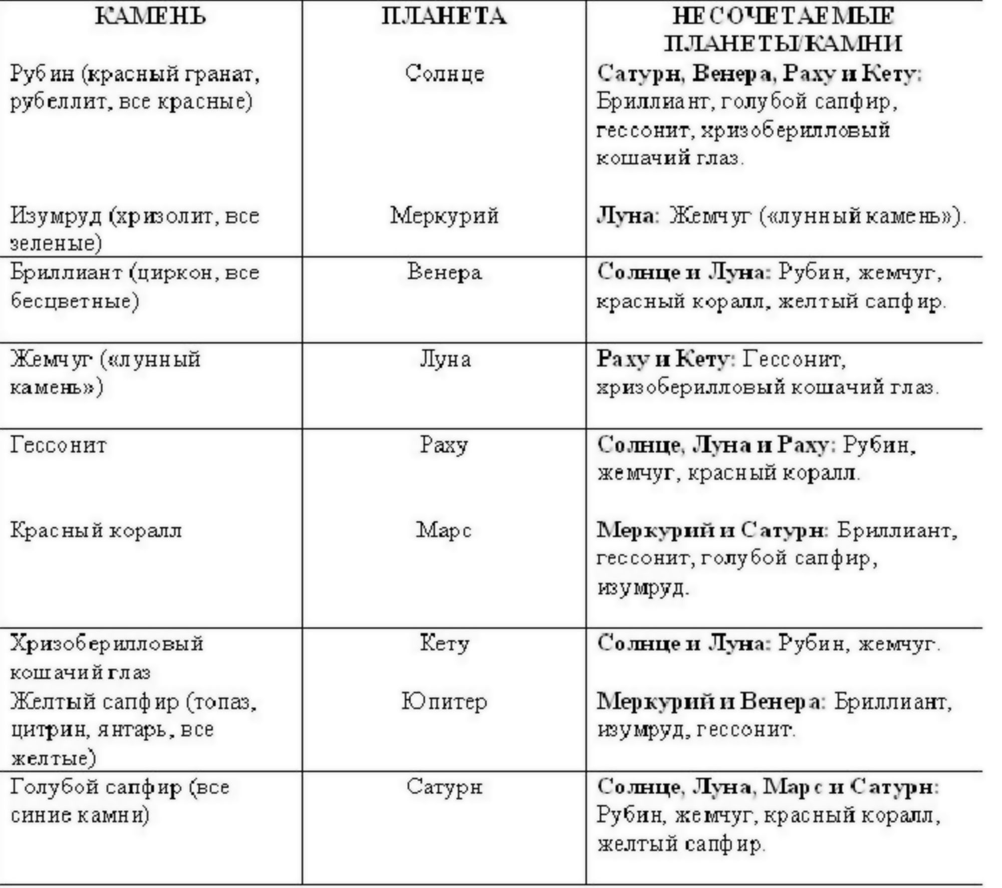 Не вдаваясь в мистицизм индийских Богов и Богинь, привожу таблицу соответствия основных камней Аюрведы планетам и их «камням-врагам», т.е. тех камней, которые не сочетаются друг с другом. Каждой из девяти основных планет соответствует определенный камень, привлекающий влияние этой планеты на организм.