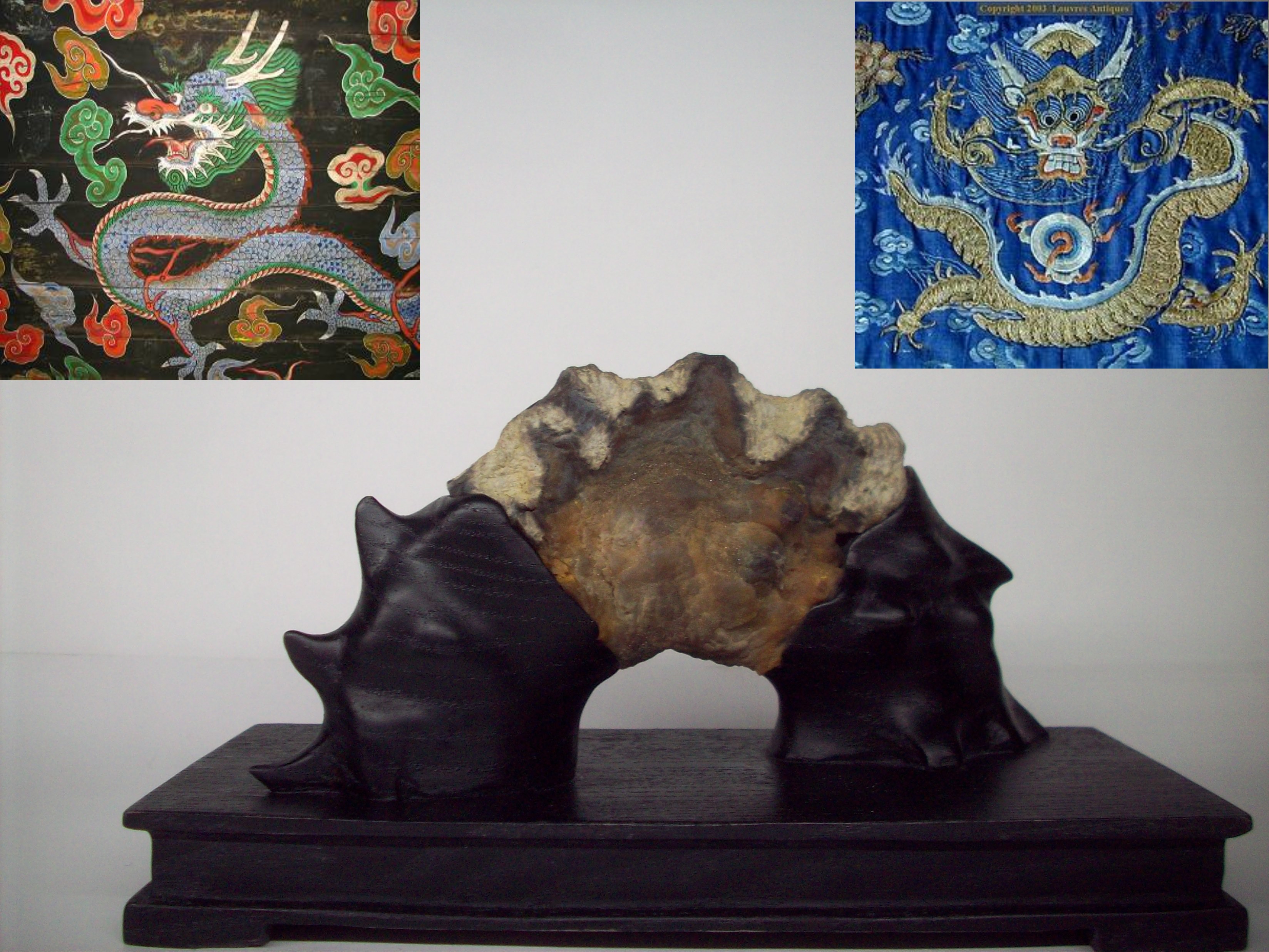 Еще одна чисто китайская работа. Цзюлун — чещуйчатый дракон (синий). Китайцы считают себя потомками Великого дракона, а по восточному гороскопу, Дракон считается самым счастливым знаком. Дракон являлся божеством, защищавшим людей от зла и нечисти. В праздник дракон поднимает голову, а люди, согласно обычаю, сыпали перед домом и вокруг золу в целях изгнания ядовитых тварей. Золу насыпали так, чтобы она напоминала очертания дракона. Таким образом ядовитые твари не могли проникнуть в дом и жилые помещения. Такой обычай является одним из древних. На раскопках древней стоянки Чахай был обнаружен дракон, выложенный из камней длиной в 19.7 метра. Он находился как раз перед главным домом и, понятно, играл роль духа- защитника людей. По существу это очень похоже на традицию сыпать золу перед домом. И до сих пор китайский народ почитает дракона, как бога-хранителя. В праздники китайский народ танцует танцы с драконами и львами, которые символизируют счастье и благоденствие, олицетворяют силу отражения зла и недобрых духов. В конце периода Воюющих царств ( 5-3 вв. до. н.э. ) люди называли первого китайского императора Цин Шихуана- " драконовым предком" китайской нации . Китайские императоры называли себя сынами небесного дракона. Императорский дракон Китая имел пять когтей на лапах и был небесно-лазурного цвета. Никто иной, кроме императора Китая, под страхом смертной казни не смел носить такую символику на одежде, украшать ей дома и делать рисунки. Трон императора именовался Троном Дракона; лицо императора - Лицом Дракона.