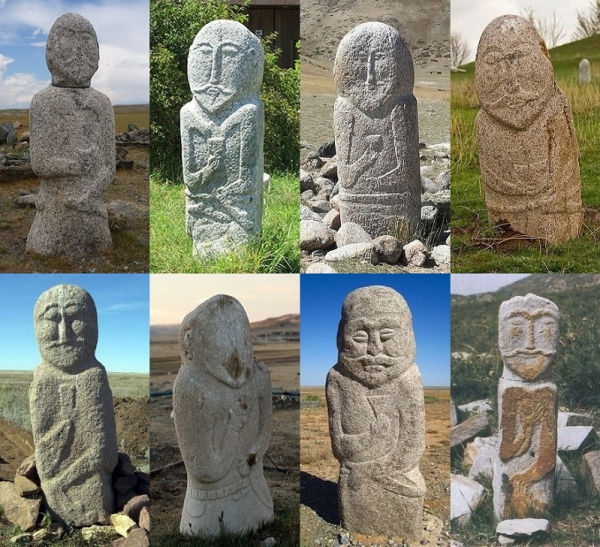 Да, чем богата казахская степь, так это древними могильниками! Один из них представляют собой обычные курганы, другие из грубо отесанного камня, третьи- дольмены, или каменные бабы, как называют их ученые... Обычно стоит такая массивная каменная фигура на небольшом возвышении. Очертаниями напоминает она женщину, но бывают у некоторых старомонгольские усы. У одних на сведенных перед грудью ладонях видна чаша - кесе, у других булава. Иногда рядом с таким дольменом возведена маленькая крепость из дикого камня. А от нее через каждые двести-триста шагов лежат слегка обточенные четырехгранные камни - балбалы - до следующего дольмена. .... (Хан Кене, Есенберлин)