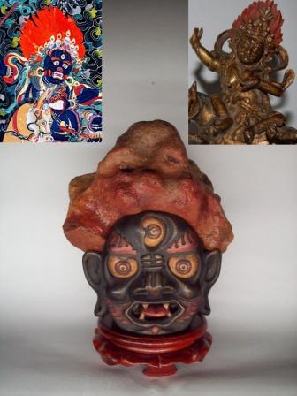 Это Палден Лхамо - основная защитница в Тибетском Буддизме и единственное женское божество.Лхамо едет на своём диком муле по морю крови и жира. Она - чёрно-синего цвета, с обвисшей грудью, горящими бровями и усами. Её красные волосы стоят дыбом.