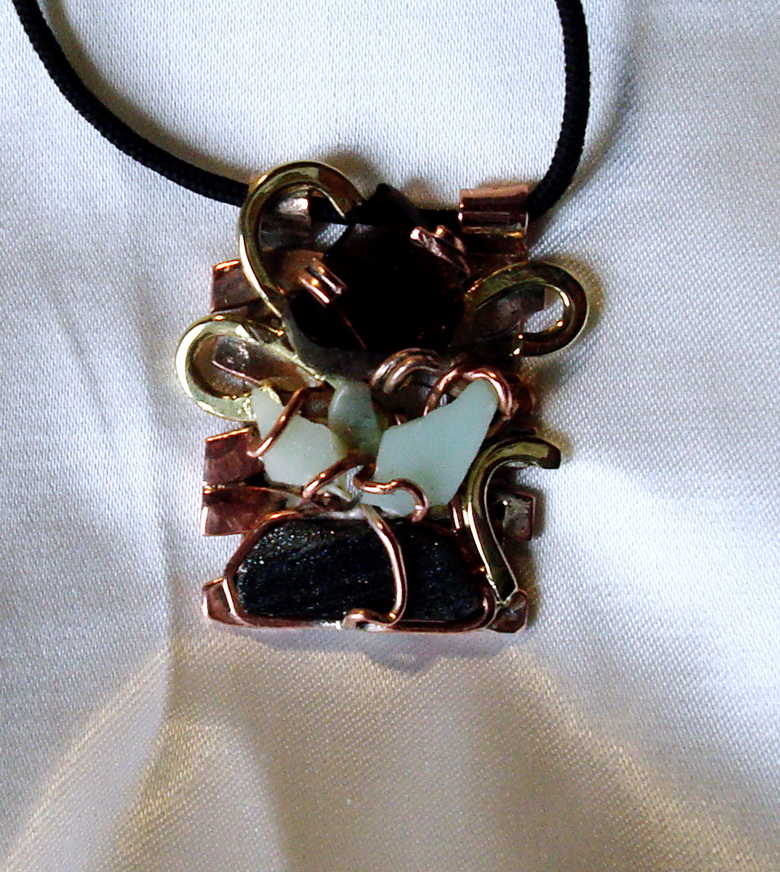 Кованая медь, латунь, спекуляритовый авантюрин, светлый хризопраз, дымчатый кварц.