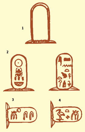 Эту эмблему в виде овала с прямой линией на торце часто называют картуш. Внутри располагается написанное иероглифами имя (например, имя фараона), которое овал символически оберегает.