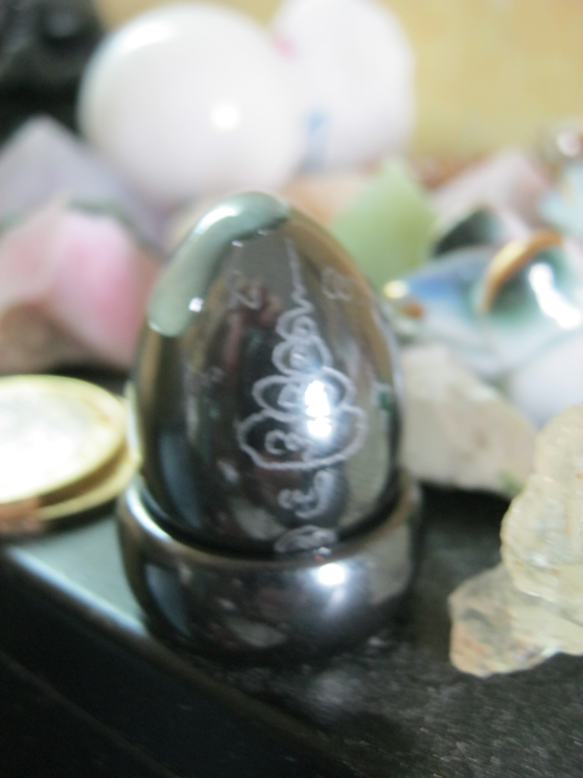 Ну очень похоже на гематит-магнетит... Только яйцо очень тяжелое по сравнению, допустим, с гематитовым браслетом. Магнетит-браслет тяжелее, чем гематит-браслет, но яйцо не имеет магнитных свойств, в отличие от колечка, но при таком небольшом объеме - тяжелее, чем даже браслет из магнетита... :)