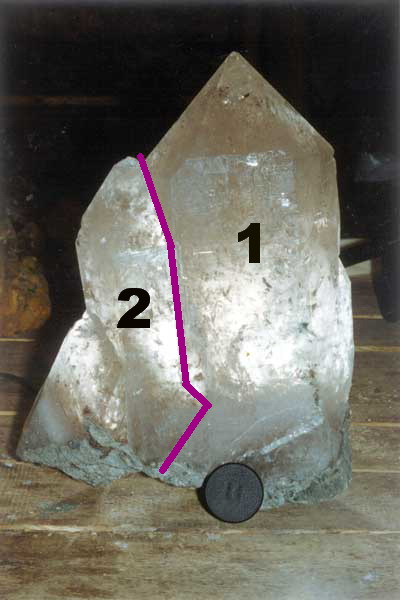 вот так растёт кварц. Если кристалл 2 отодрать от кристаллов 1 и 3, то в последних на боковых гранях останутся следы (как вмятина) от кристалла №2.