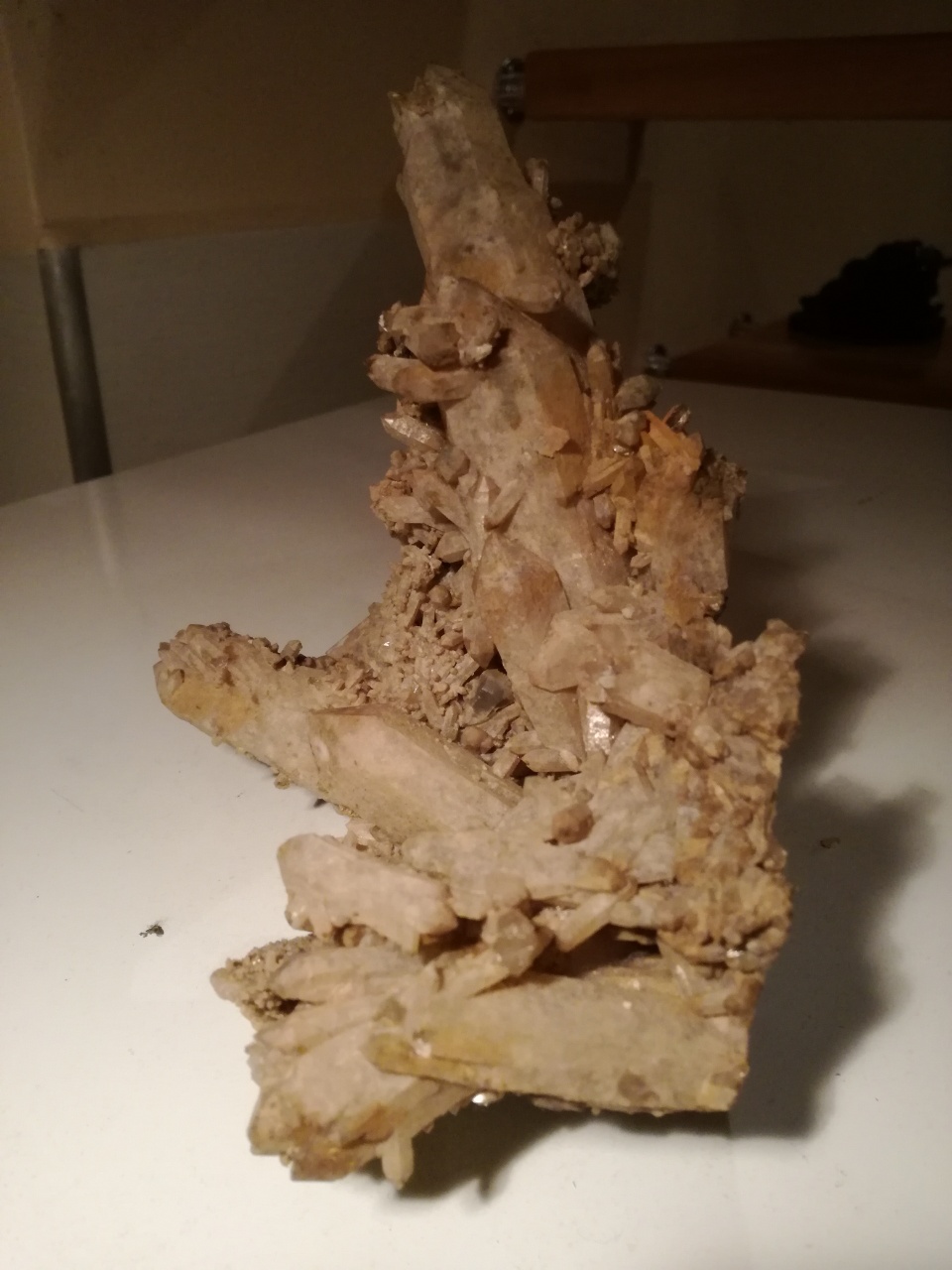 Я тоже где-то читал что можно щавелевой кислотой. Но подумав решил, что пока её чистить не буду. Есть подозрение, что если удалить этот глинисто-кварцевый налёт, то друза может развалится.