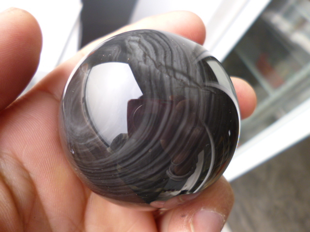 У одного шара радужность была кривой, кольца сбивались, вились с завитками, в общем не такой обсидиан, как другие... В диаметре 57 мм.