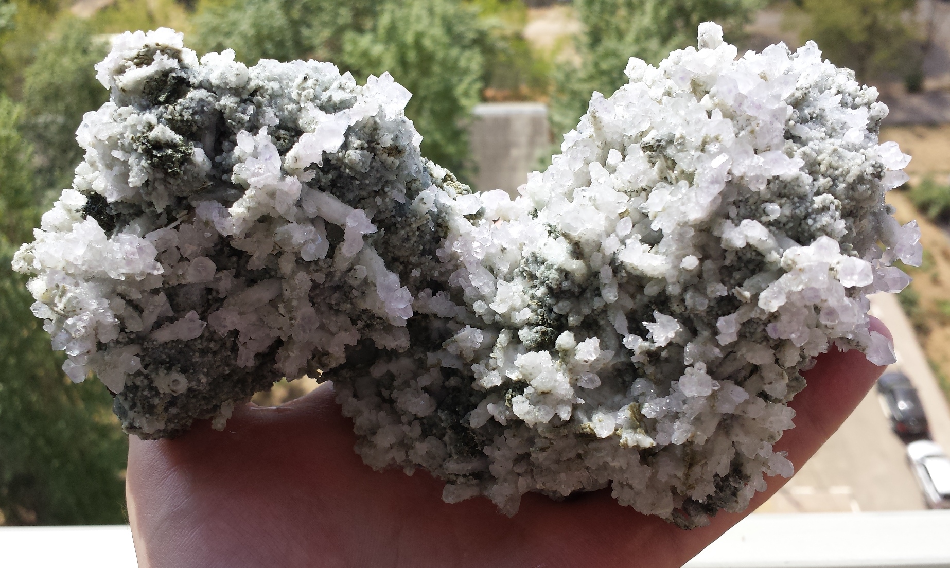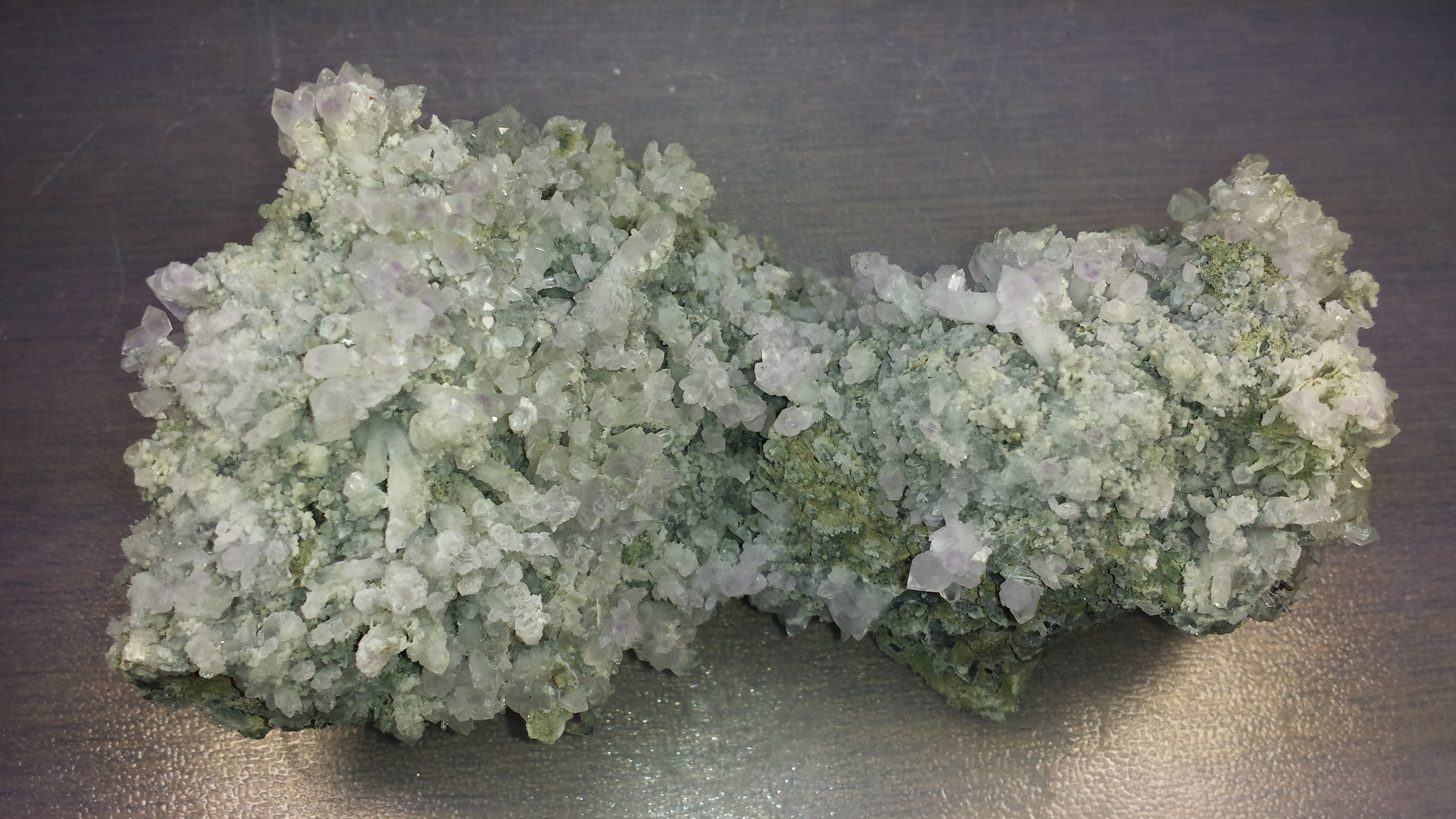 Фрагмент стенки миаролы пегматитовой жилы . Кристаллы кварца врастают в альбит-клевеландит, с вростками кристаллов фиолетового и белого расщеплённого лепидолита, покрытых корочкой цеолита,с присыпкой мелкого розового турмалина. На обратной стороне хорошо заметна поздняя генерация дымчатого кварца в виде мелких сияющих кристаллов, 190*100*130 мм, Малхан. Образец очень интересный-двусторонний! И любой стороной он достоин красоваться в коллекции. В Россию передача только поездом!